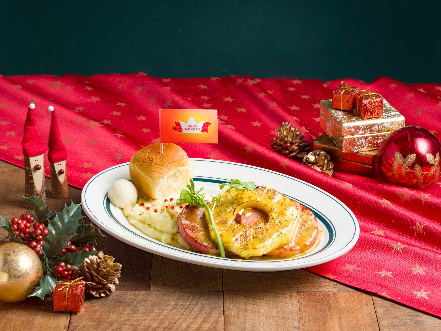 ハワイのホリデーシーズンメニューの1つとして登場する『クリスマス ハワイアン ハムステーキ with KING'S HAWAIIAN』は、こんがり焼いた厚切りのハムに甘酸っぱいパイナップル、ハニーマスタードソースをかけたハワイのホリデーシーズンに親しまれているメニューです。大人気の「KING'S HAWAIIAN」オリジナルハワイアンスウィートロールとお楽しみください。