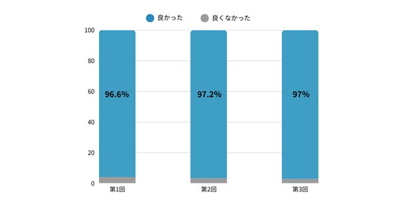 過去3回の授業後に実施したアンケートでは、3回連続で96%以上の生徒が授業を「良かった」と評価しました。