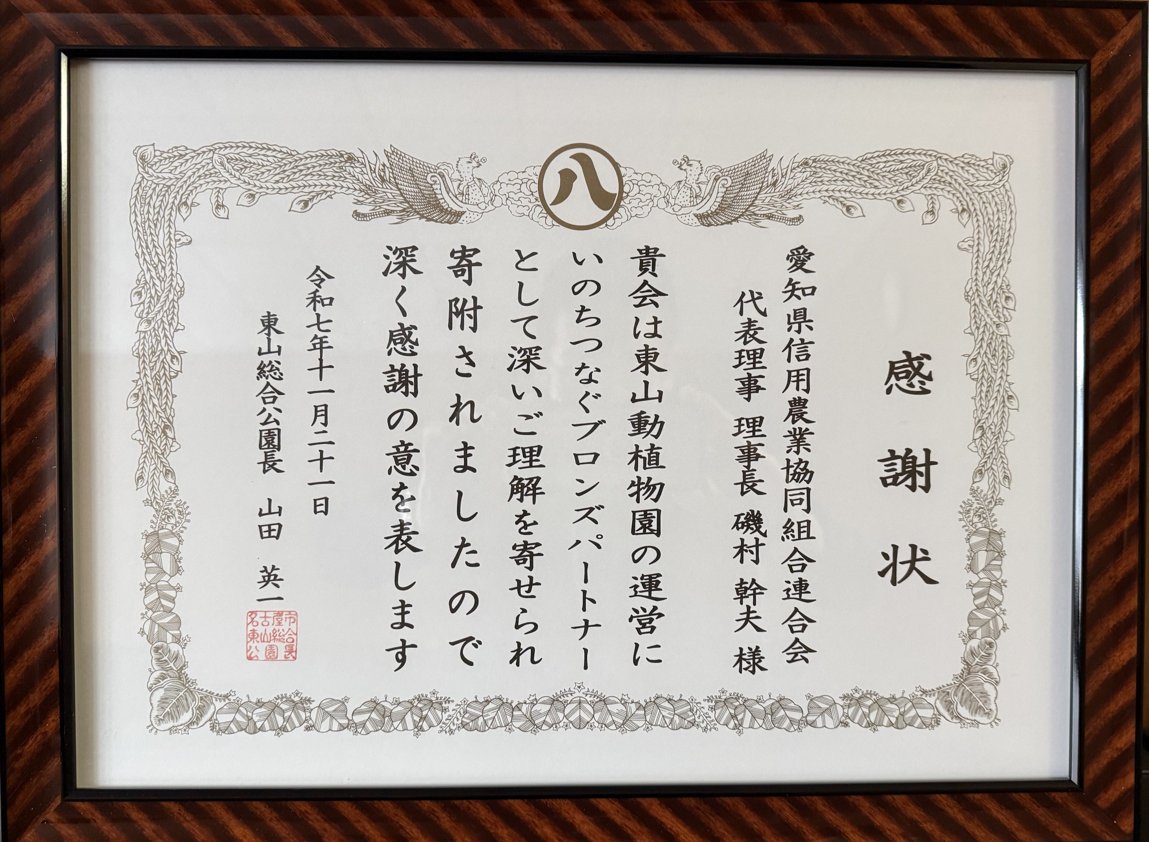 JA愛知信連(愛知県信用農業協同組合連合会 代表理事理事長:磯村幹夫)は、社会貢献活動の一環として、東山動植物園いのちつなぐ基金(名古屋市東山動植物園基金)に対し40万円を寄付し、同基金からブロンズパートナー認定を受けました。
