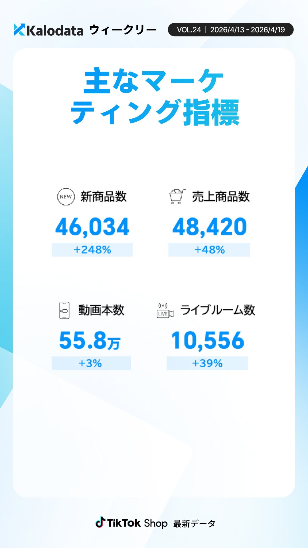 TikTok Shopデータ分析サービスKalodata Japan(運営:株式会社Kalowave Japan)の最新データによると、4月13日〜19日の日本TikTok Shop市場は、GMV11.81億円(前週比+26.3%)と大きく回復。新商品や新規ファンの数も前の週から約3.5倍以上に急増し、活気を取り戻した。