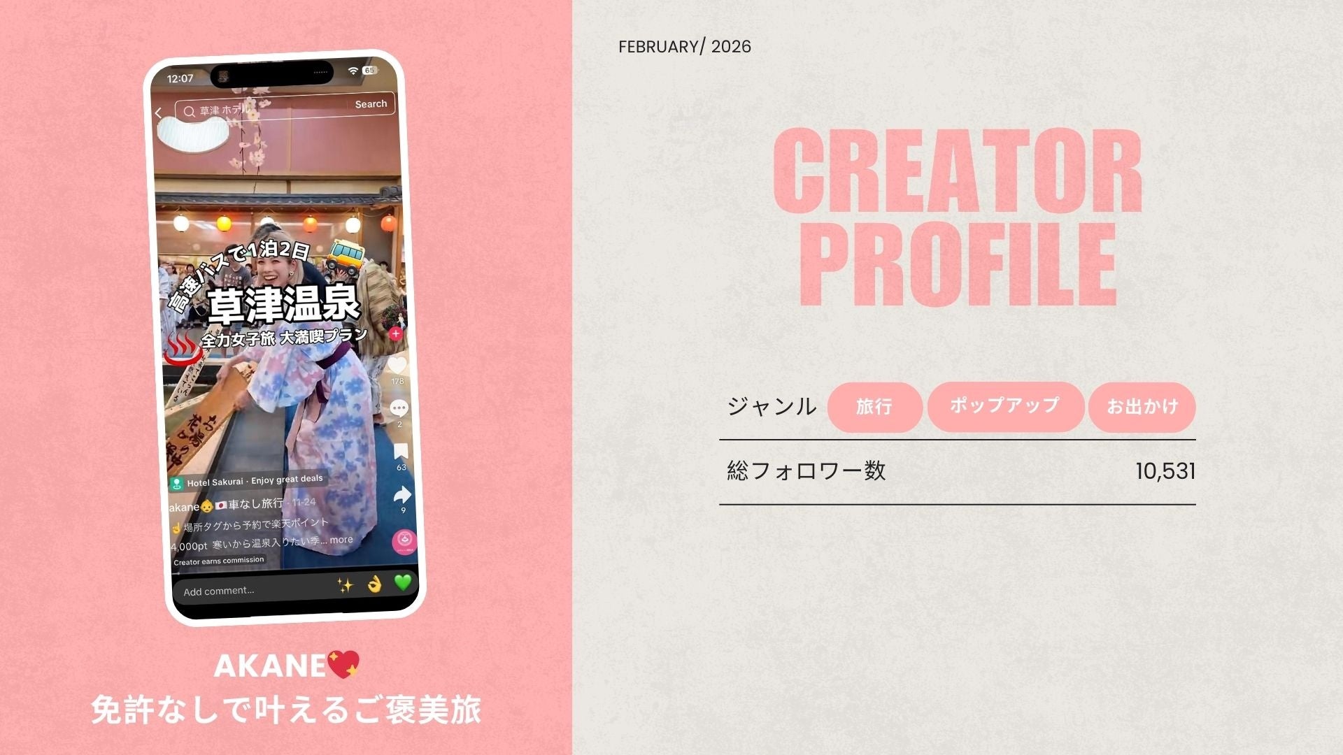「AKANE💖免許なしで叶えるご褒美旅」は、関東圏の旅先や企業・ブランドのポップアップイベントを中心に取材し、動画を制作・発信しています。これまでの投稿の中には、再生回数35万回を超える動画も。旅行・ポップアップ・おでかけ分野に強みを持つ同メディアの加盟により、SNS上でのイベント認知や集客の効果がさらに期待できます。