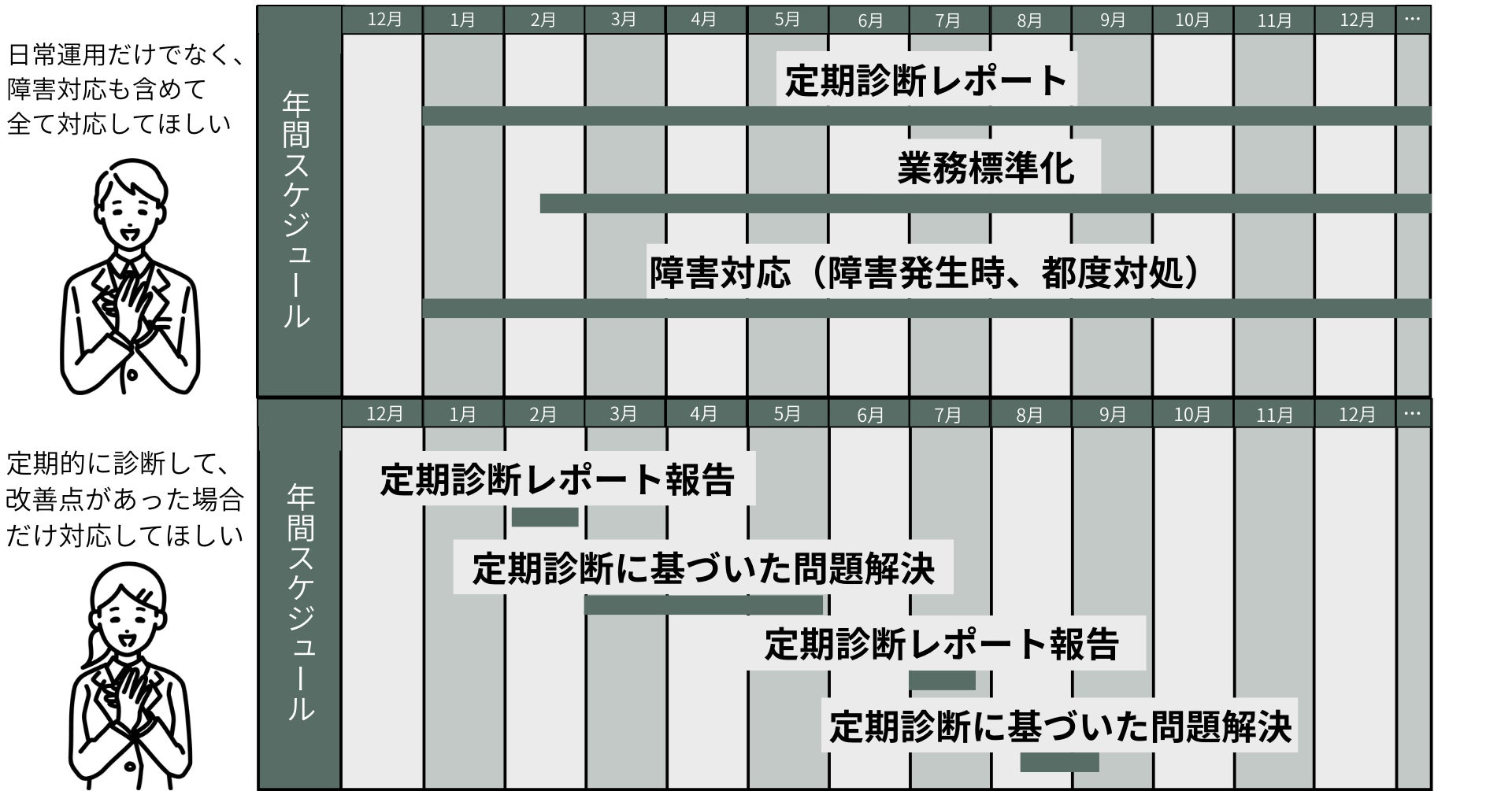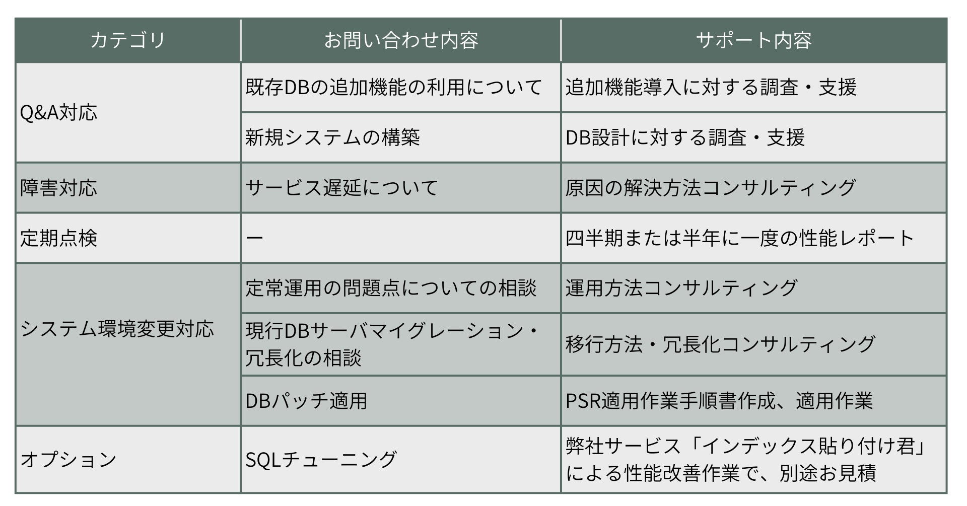 お客様先にDB技術者が常駐するのではなく、【必要になった時】に【必要な作業内容と作業量】をオンデマンドに対応致します。お問い合わせに対して専門のエンジニアが電話とメールで対応致します。直接データベースサーバへアクセスするような対応の場合は、当社内からのリモートアクセスにて対応(条件によりオンサイトでも対応)致します。