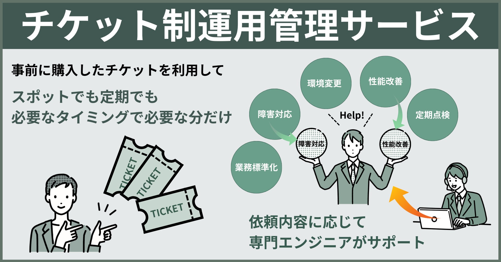 チケットを利用してご依頼いただいた内容に対し、お客様の環境を把握した専任の運用支援チームが、お客様専任の担当コンサルタントとしてお客様の窓口となり、課題解決に向けて対応・支援します。お電話/メールでのサポート、そして必要に応じてオンサイト対応を致します。