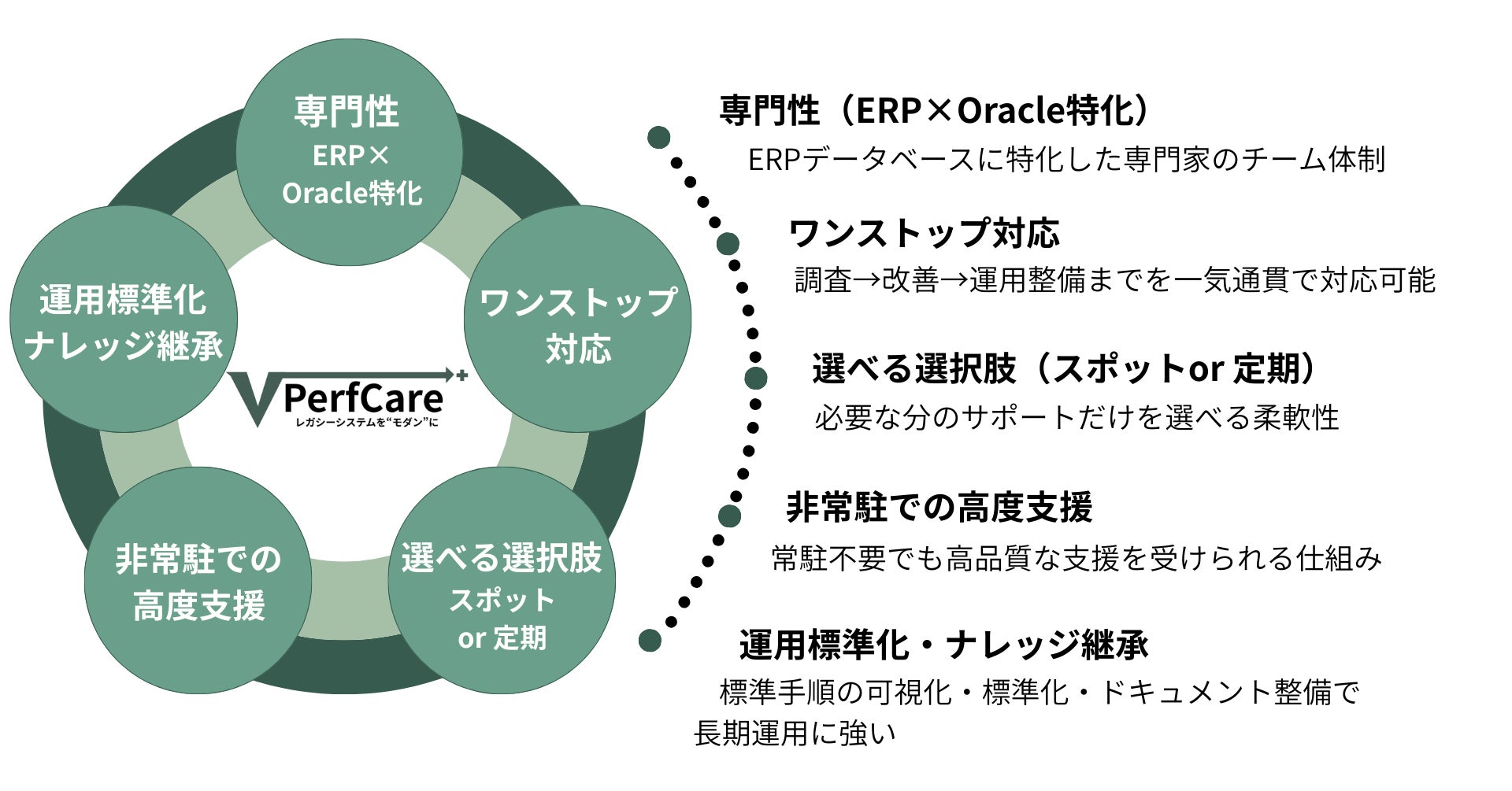 こうした課題に対し、VENTURY PerfCare(パーフケア)は、「ERP × Oracle Database」に特化した専門チームとして、「属人化の解消・性能最適化・運用の標準化」を通じて、“専門のデータベース管理者がいなくても安心できる運用体制の実現”を支援します。
