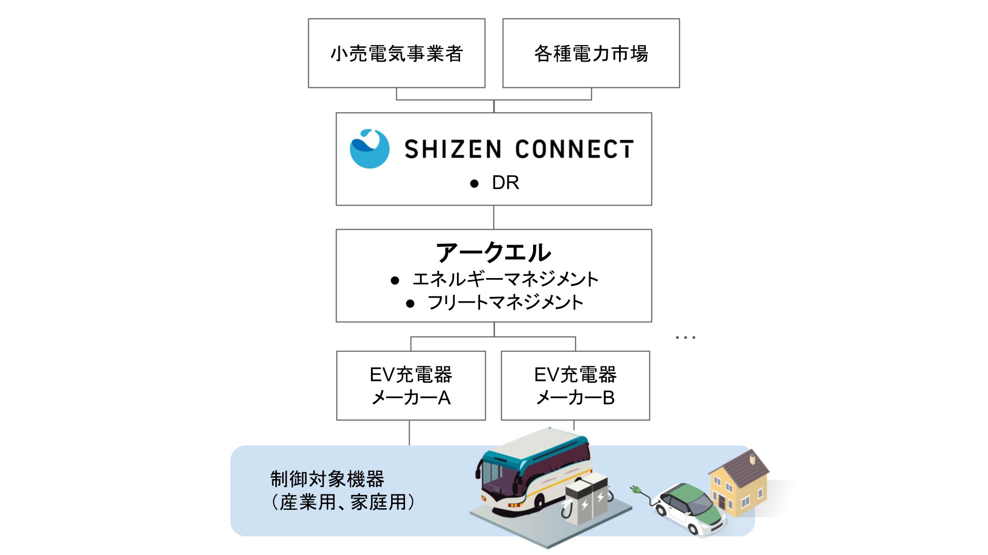 市場シェアNo.1のVPP(*1)プラットフォーム開発会社である株式会社Shizen Connect(以下、Shizen Connect)は、EVスマート充電・運行管理システムを提供するアークエル株式会社(以下、「アークエル」)と、EVの遠隔制御によるDR制御(*2)サービスの提供(以下、本協業)を目的としたパートナー契約を締結したことを発表します。