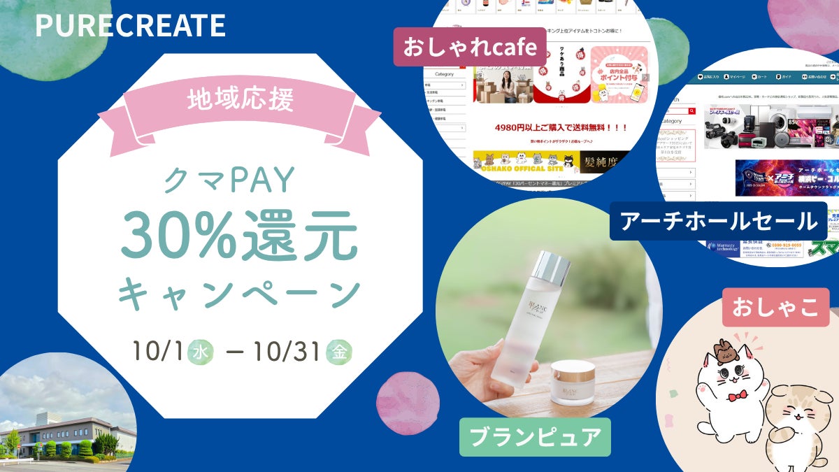 埼玉県熊谷市を拠点にECサイトを展開するピュアクリエイト株式会社(本社:埼玉県熊谷市)は、熊谷市が実施する「クマPAY『30パーセントマネー還元』プレミアムキャンペーン」に、当社が運営する「アーチホールセール」「おしゃれcafe」「ブランピュア」の3店舗すべてが対象店舗として参加することをお知らせいたします。2025年10月1日(水)から開始された本キャンペーンにおいて、当社での商品引き取り時に「クマPAY」でお支払いいただくことで、お得に商品をご購入いただけます。