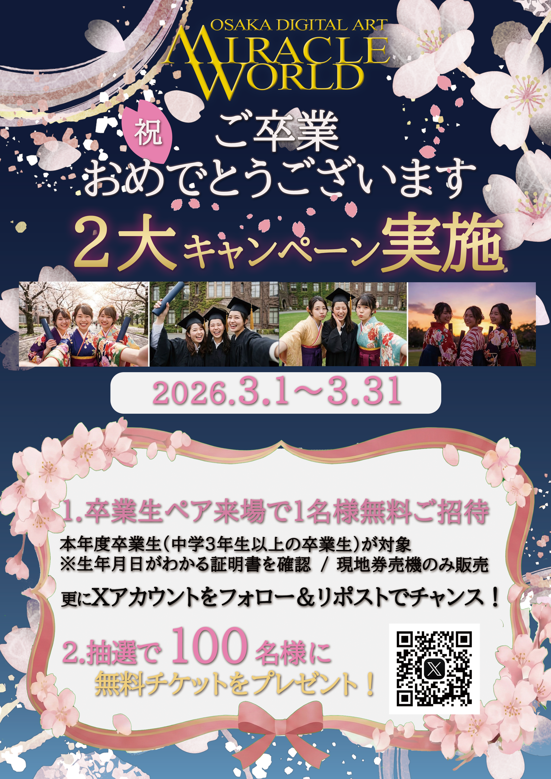 株式会社MIRACLE WORLD(所在地:大阪市浪速区)は、大阪・なんばの体験型デジタルアートミュージアム『MIRACLE WORLD(ミラクルワールド)』にて、2026年3月1日(日)より、春の卒業シーズンに合わせた特別施策を実施いたします。