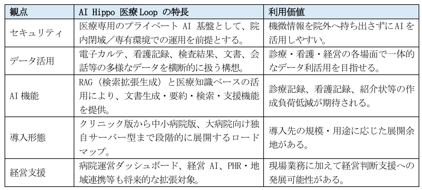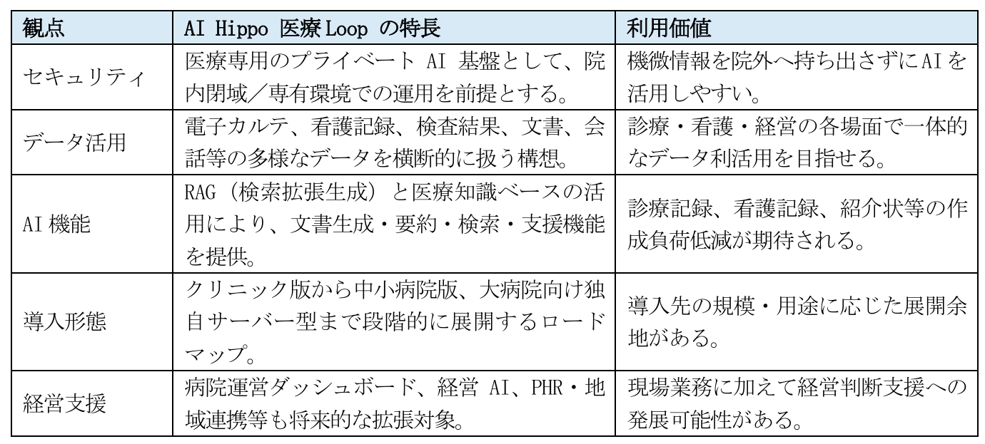 「AI Hippo 医療Loop」 は、医療機関内に閉じた環境での運用を志向する医療専用プライベートAI基 盤です。電子カルテ、看護記録、検査結果、各種文書等のデータを安全に活用しながら、診療支援、看 護DX、経営分析等に展開する構想が示されています。