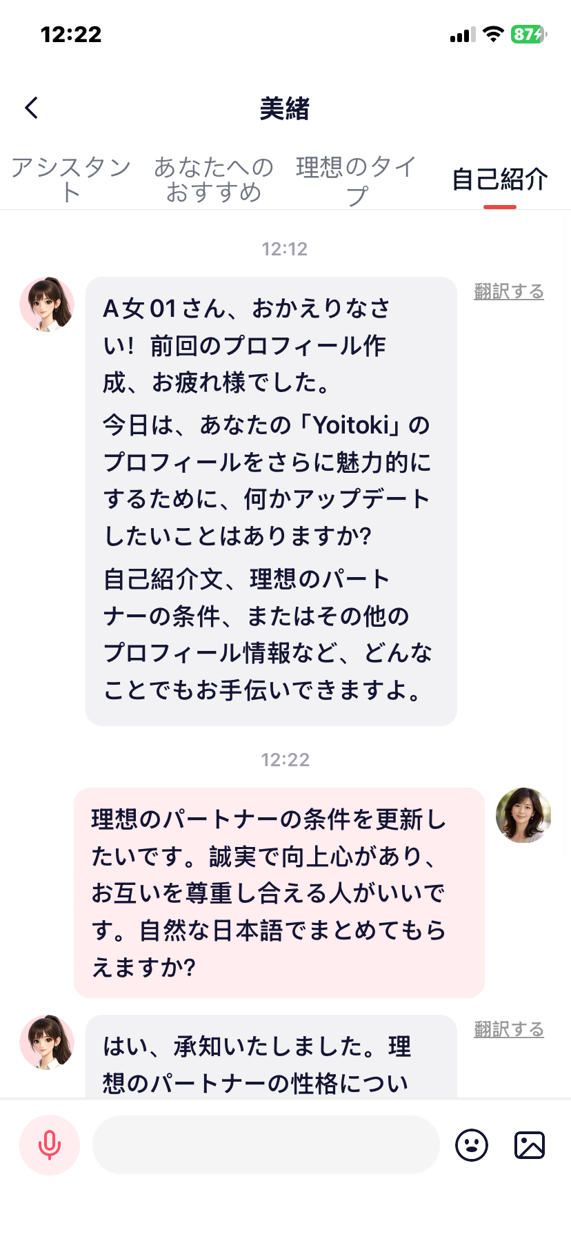 アシスタント機能 — プロフィールの自己紹介文や理想のパートナー条件など、登録情報の改善を対話形式でサポート。「どう書けばいいかわからない」という悩みに、具体的な言葉で寄り添います。