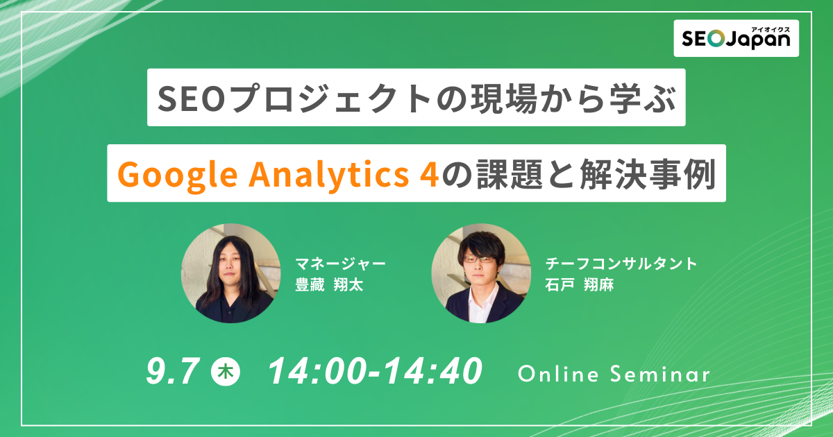 【SEOプロジェクトの現場から学ぶ Google Analytics4 の課題と解決事例】SEO Japan@アイオイクスが無料ウェビナーを9/7(木)開催