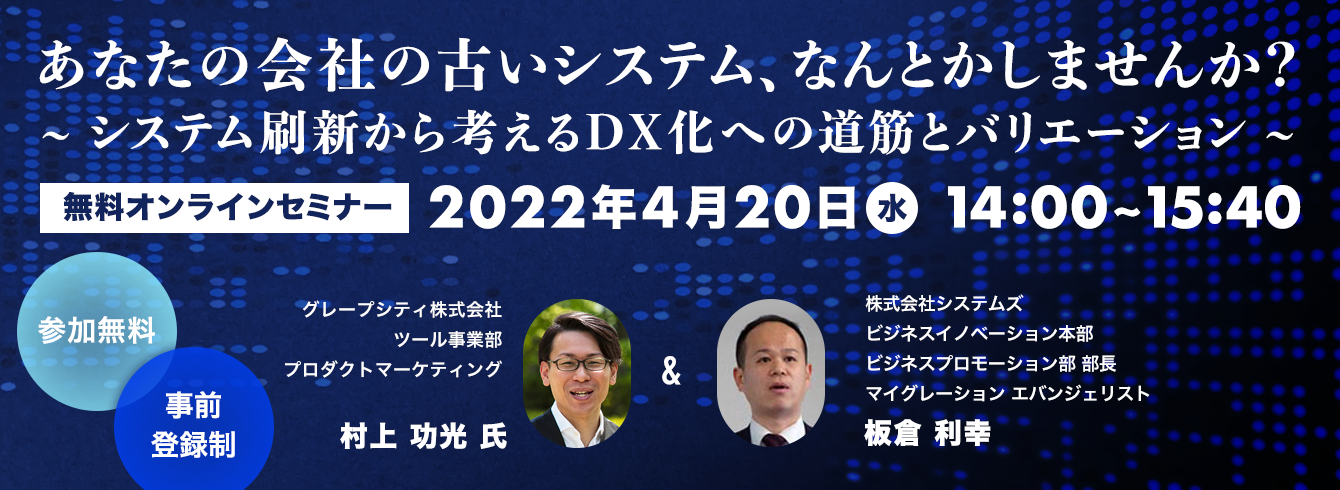 株式会社システムズ(本社:東京都品川区、代表取締役社長:小河原隆史)は、4月20日(水)に「あなたの会社の古いシステム、なんとかしませんか? ~システム刷新から考えるDX化への道筋とバリエーション~」と題した、システムズとグレープシティによる共同Webセミナーを開催します。
