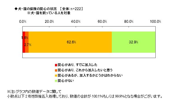 「犬」もしくは「猫」を飼っている人を対象に、最近発表された「犬・猫用保険」の関心の有無を聞いたところ、「関心があり、すでに加入した」1.8%、「関心があり、これから加入したいと思う」2.7%、「関心があるが、加入するかどうかはわからない」62.6%となり、『関心がある』と回答した人は約7割に上りました。ペットフードや動物医療の進歩によって、ペットの寿命自体が伸びる傾向にあり、医療費自体の拡大に対する不安が高まっていると同時に、一緒に過ごす時間が増えてペットを家族のように扱う家庭が増えている事からも、犬・猫保険の関心の高さがうかがえる結果となりました。