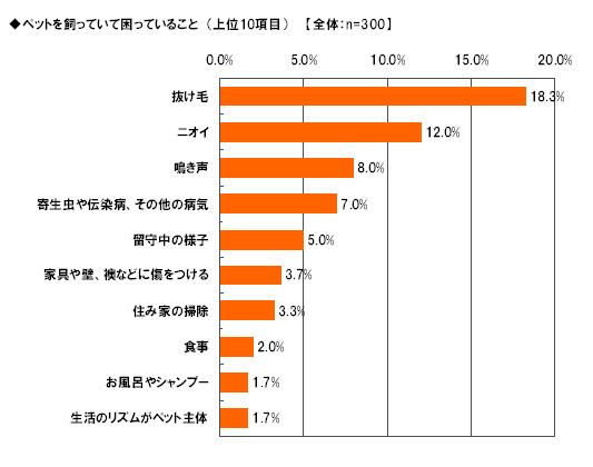 ペットを飼っていて最も困ることを尋ねたところ、トップになったのは「抜け毛」18.3%、2位「ニオイ」12.0%、3位「鳴き声」8.0%、4位「寄生虫や伝染病、その他の病気」7.0%、5位「留守中の様子」5.0%という結果になりました。