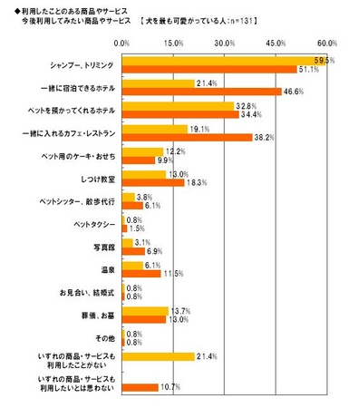 現在飼っているペットの中で「犬を最も可愛がっている」人(131名)に、現在利用している商品やサービスを複数回答形式で聞いたところ、1位 「シャンプー、トリミング」59.5%、2位「ペットを預かってくれるホテル」32.8%、3位は「一緒に宿泊できるホテル」21.4%、4位が「一緒に入れるカフェ・レストラン」19.1%、5位以下は「葬儀・お墓」13.7%、「しつけ教室」13.0%、「ペット用のケーキ・おせち」12.2%という結果になりました。