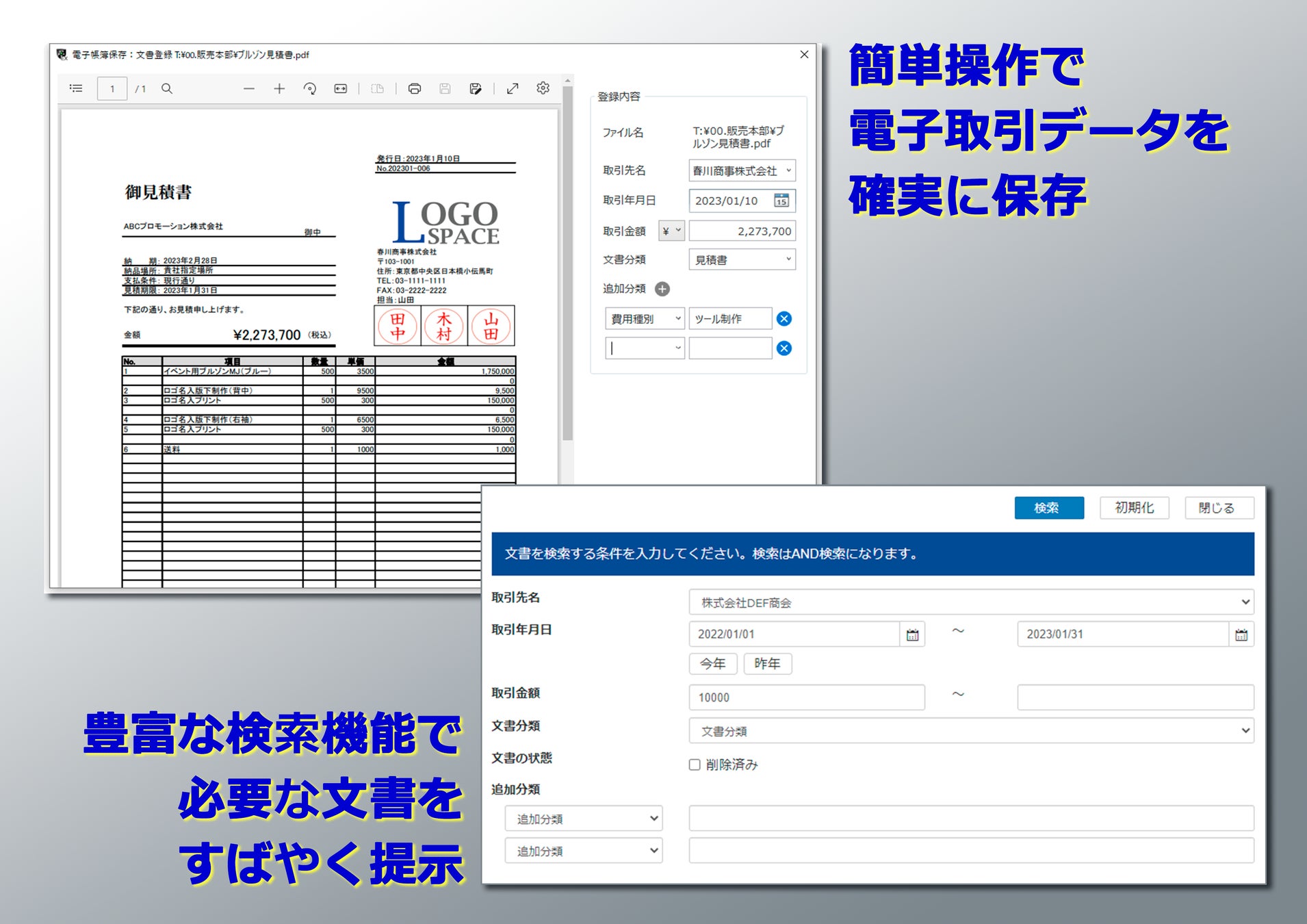 ※2 「可視性の確保」のため、本キットは「取引年月日の範囲・取引金額の範囲・取引先で複合検索できる」要件を満たします。その他の要件(保存場所にPCやプログラム、ディスプレイ、プリンターの各設備と操作マニュアルを用意してデータを整然・明瞭・速やかに出力できること、自社開発システムの場合はシステム概要書類を備えつけること)もあわせて備える必要があります。
