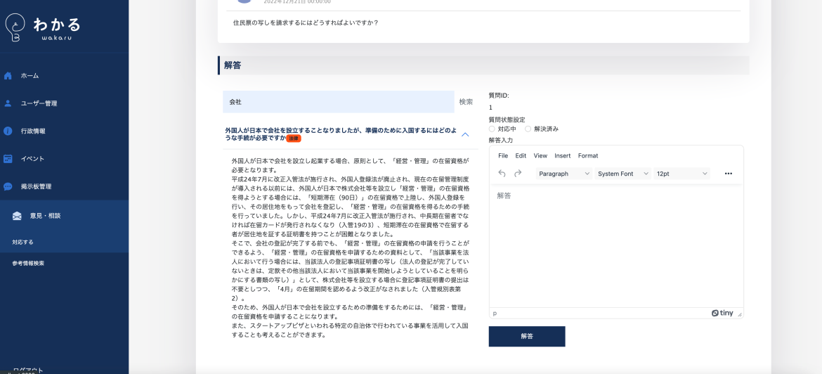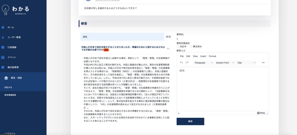 これにより、自治体の職員の方々が外国人を含む住民から法律に関わる質問の回答を行う際などに、本サービス内で回答の候補となるQ&Aを即座に検索・確認することができ、業務効率化に繋がります。また、自治体の職員の方々が住民に対して行った回答はサービス上に保存可能であるため、ナレッジの蓄積が実現できます。