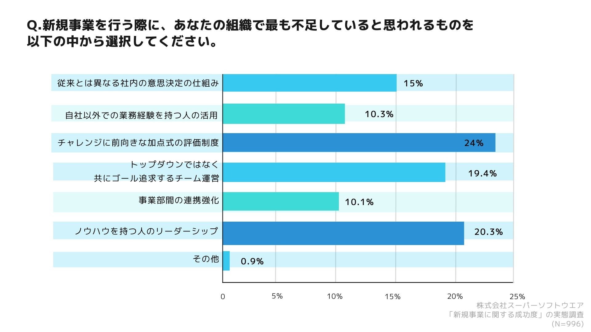 「新規事業を行う際に、あなたの組織で最も不足していると思われるものを以下の中から選択してください」という質問に対して、「従来とは異なる社内の意思決定の仕組み」が15%、「自社以外での業務経験を持つ人の活用」が10.3%、「チャレンジに前向きな加点式の評価制度」が24%、「トップダウンではなく共にゴール追求するチーム運営」が19.4%、「事業部間の連携強化」が10.1%、「ノウハウを持つ人のリーダーシップ」が20.3%、「その他」が0.9%となりました。