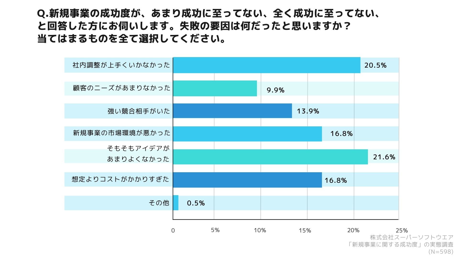 「新規事業の成功度が、あまり成功に至ってない、全く成功に至ってない、と回答した方にお伺いします。失敗の要因は何だったと思いますか?」(n=598)と質問したところ、「社内調整が上手くいかなかった」が20.5%、「顧客のニーズがあまりなかった」が9.9%、「強い競合相手がいた」が13.9%、「新規事業の市場環境が悪かった」が16.8%、「そもそもアイデアがあまりよくなかった」が21.6%、「想定よりコストがかかりすぎた」が16.8%、「その他」が0.5%となりました。