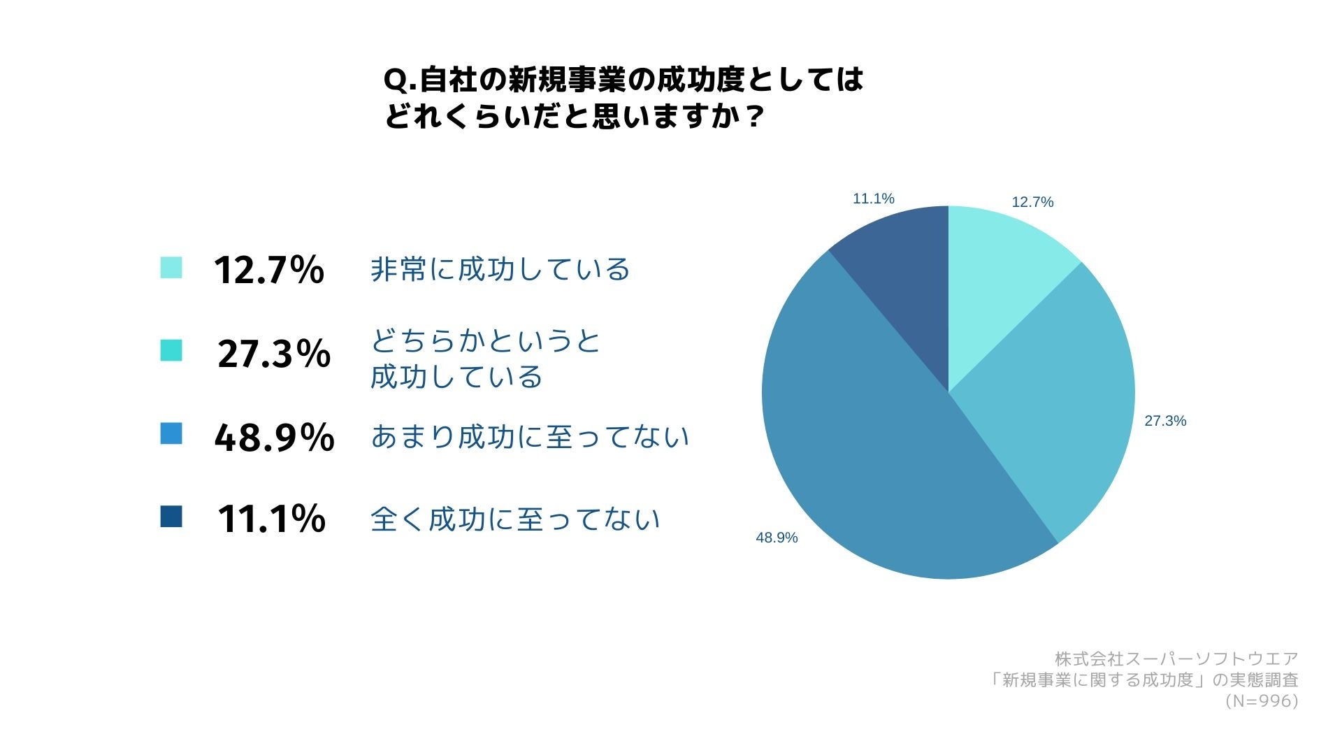 「自社の新規事業の成功度としてはどれくらいだと思いますか?」(n=996)と質問したところ、「非常に成功している」が12.7%、「どちらかというと成功している」が27.3%、「あまり成功に至ってない」が48.9%、「全く成功に至ってない」が11.1%という回答になり、まとめると失敗が60%となりました。