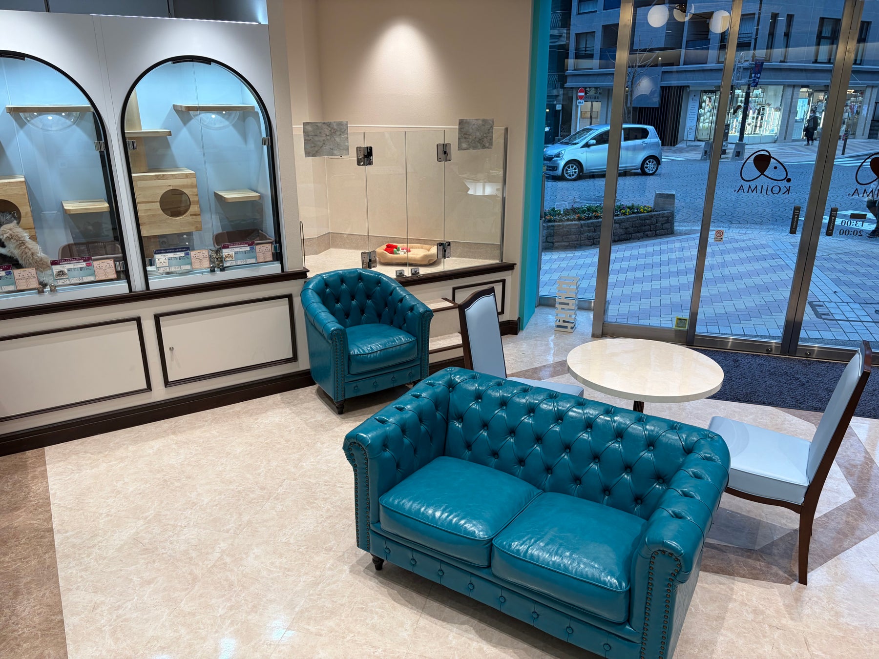 外観および内観には、幸福の象徴であり、清潔感と高揚感を演出するブルーカラーを採用いたしました。店舗スタッフも本店舗専用のモダンで清潔感あふれる制服を着用します。大切な命との出会いの場にふさわしい、洗練された空間でお迎えいたします。