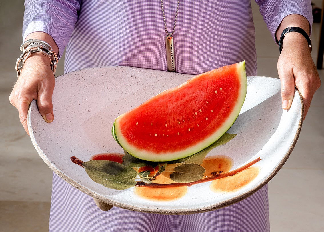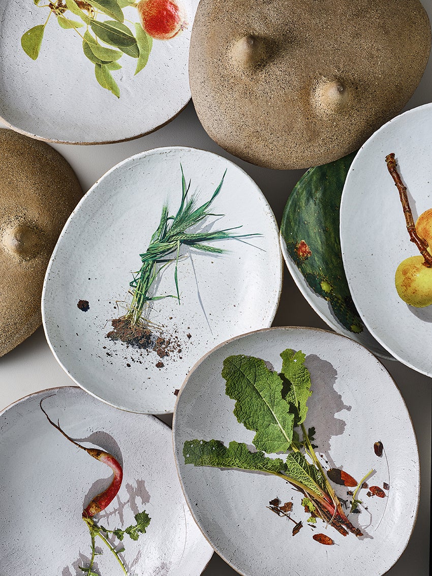 撮影は全て自然光で行われ、明るい光と影を取り込みます。対象に選ばれる大地の恵みは、どれもがその土地で何世代にもわたり進化した種から栽培されたものです。そして一つ一つの器に重ねられる画像は、オルナが試行錯誤の末、独自に編み出した革新的な技術により実現させています。