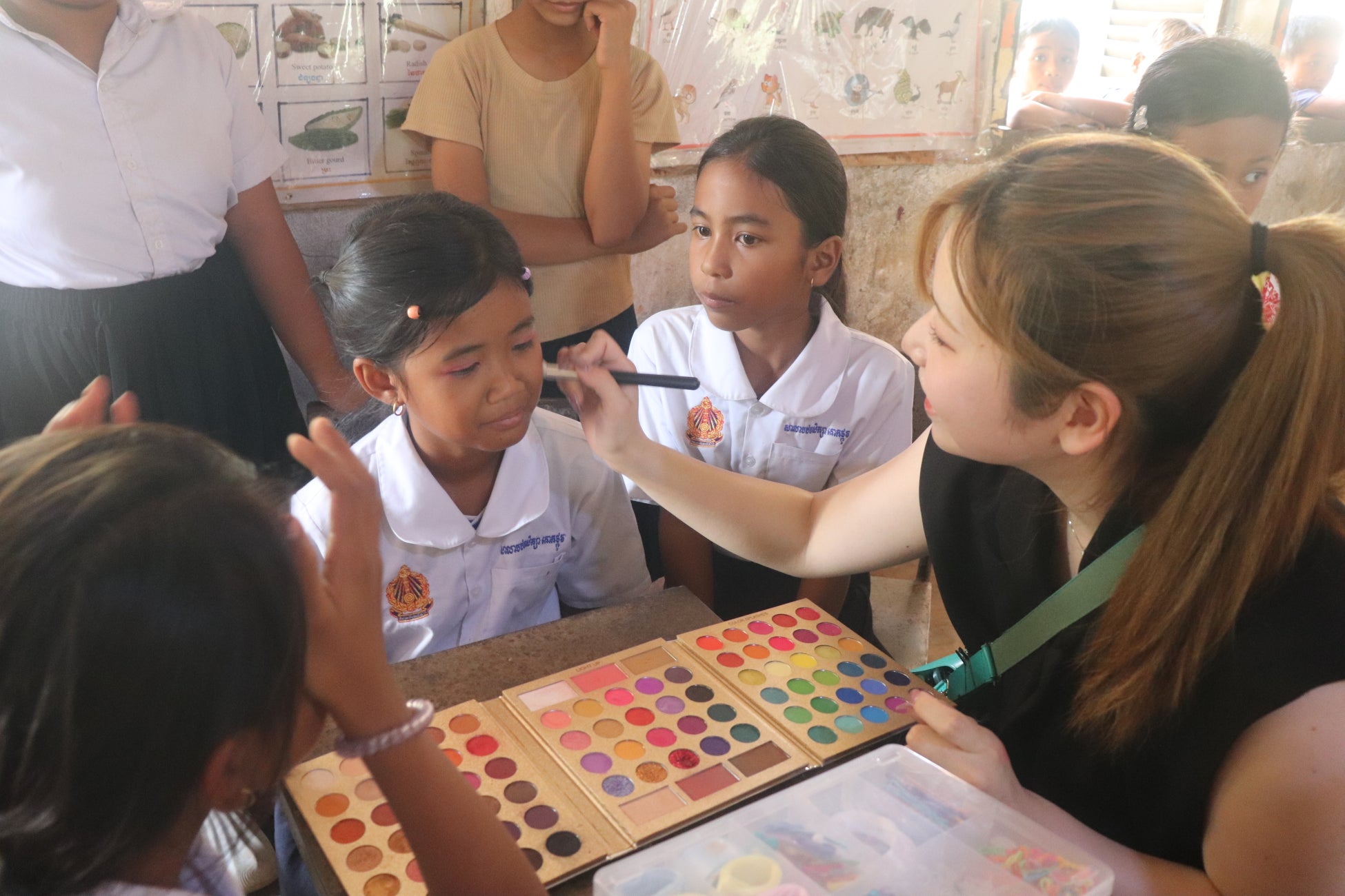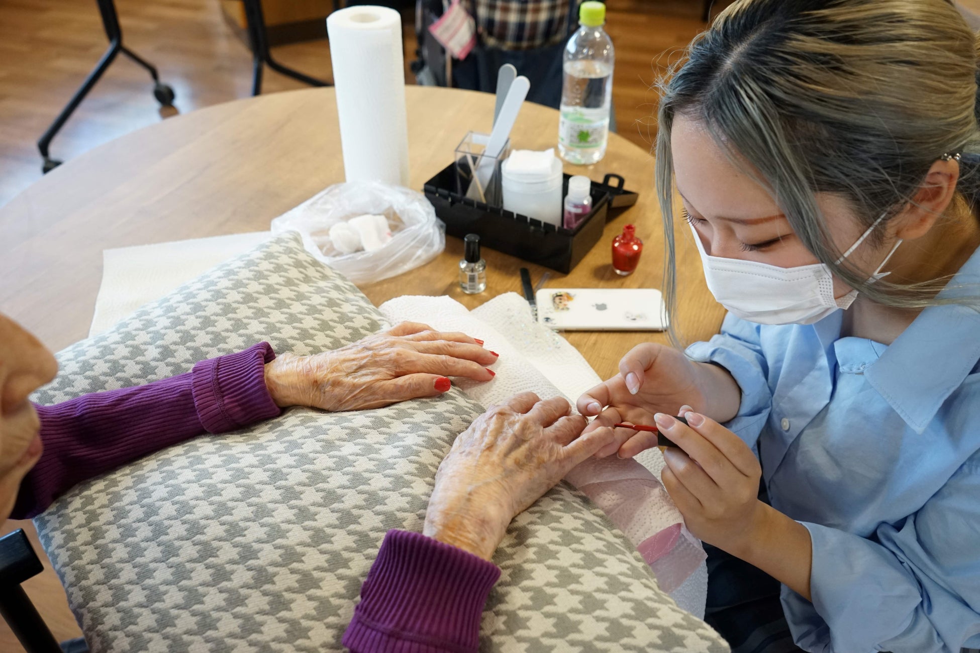 学校で学んだ技術を生かし、現地の子どもたちやお年寄りの方にヘアメイク・ネイルをします。