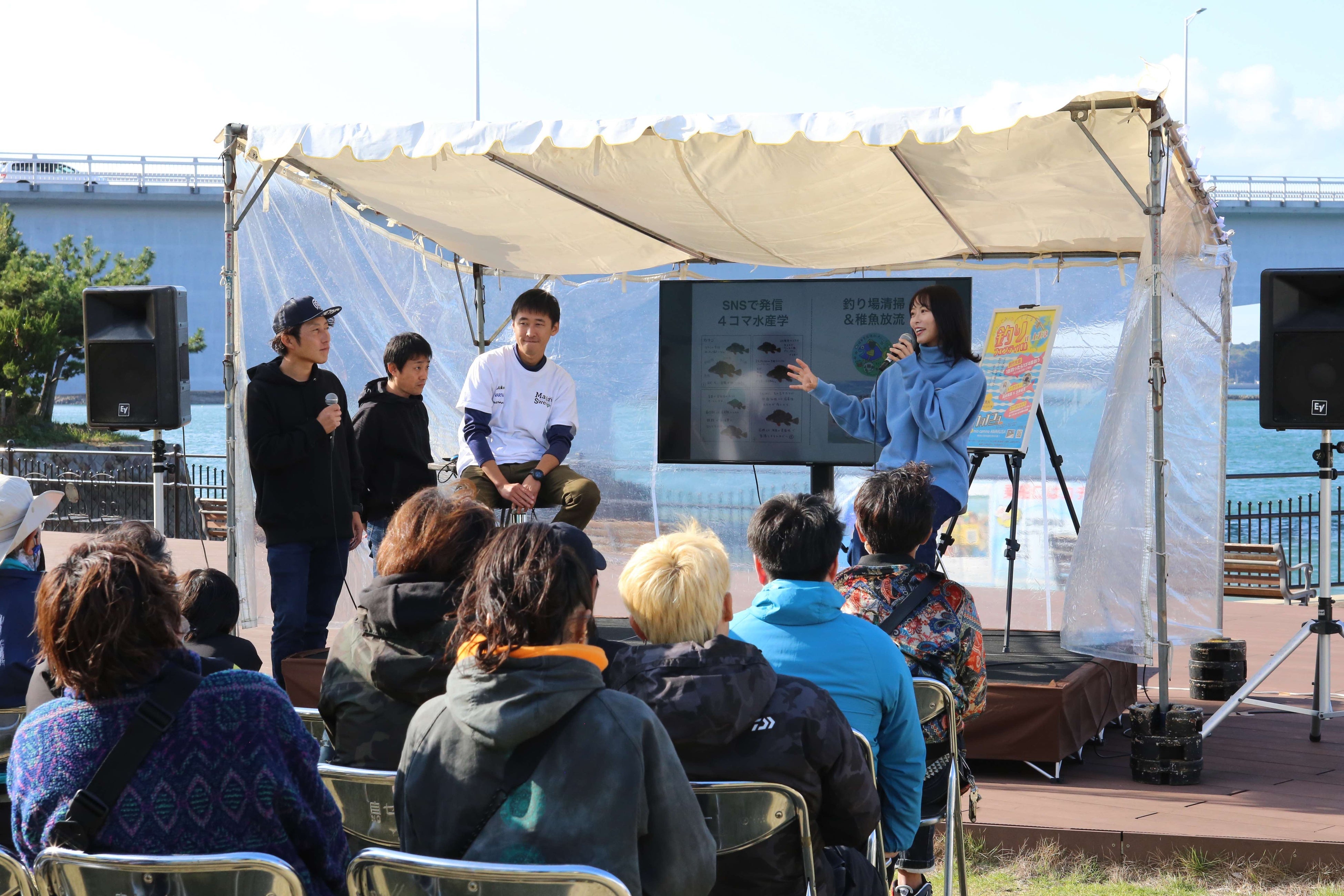 トークショーでは、釣りタレントの高本采実さんと海中清掃家の土井佑太(マリンスイーパー)さんをゲストに迎え、お二人が取り組む釣り場・環境保全活動に関する紹介のほか、今釣り人にできることを語り合いました。