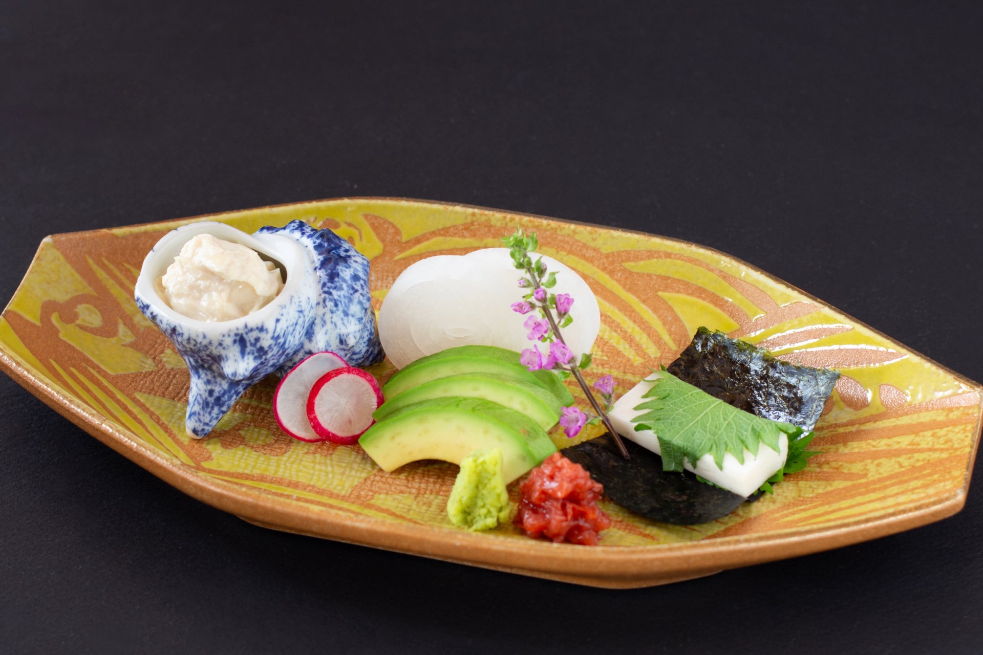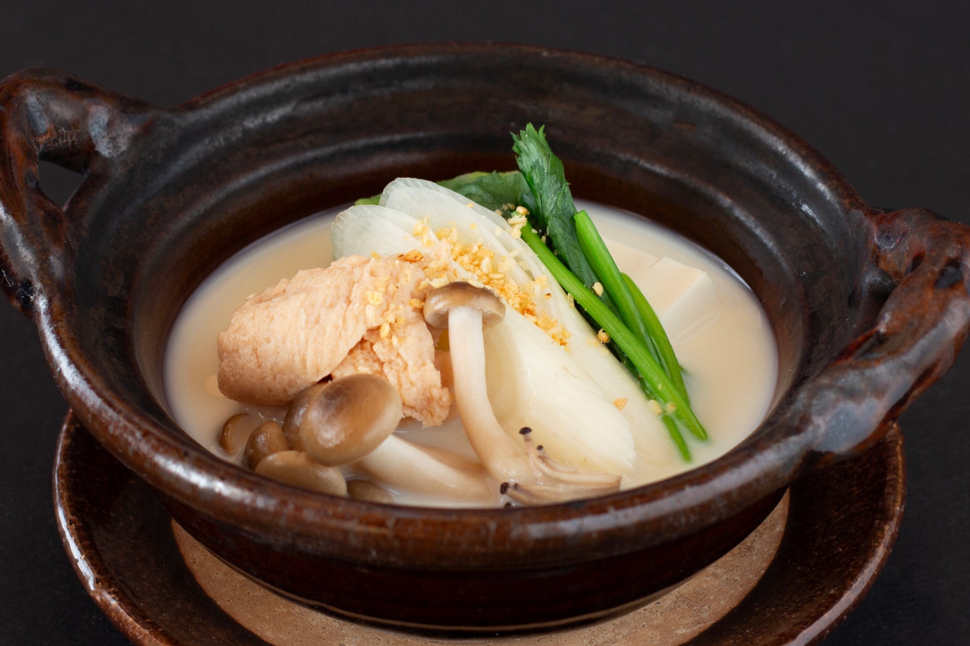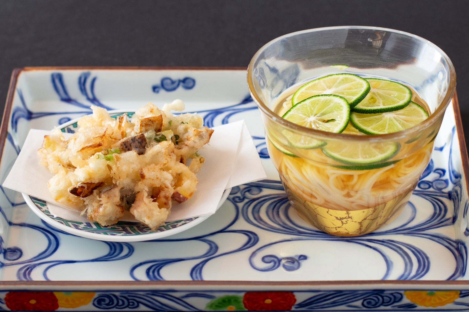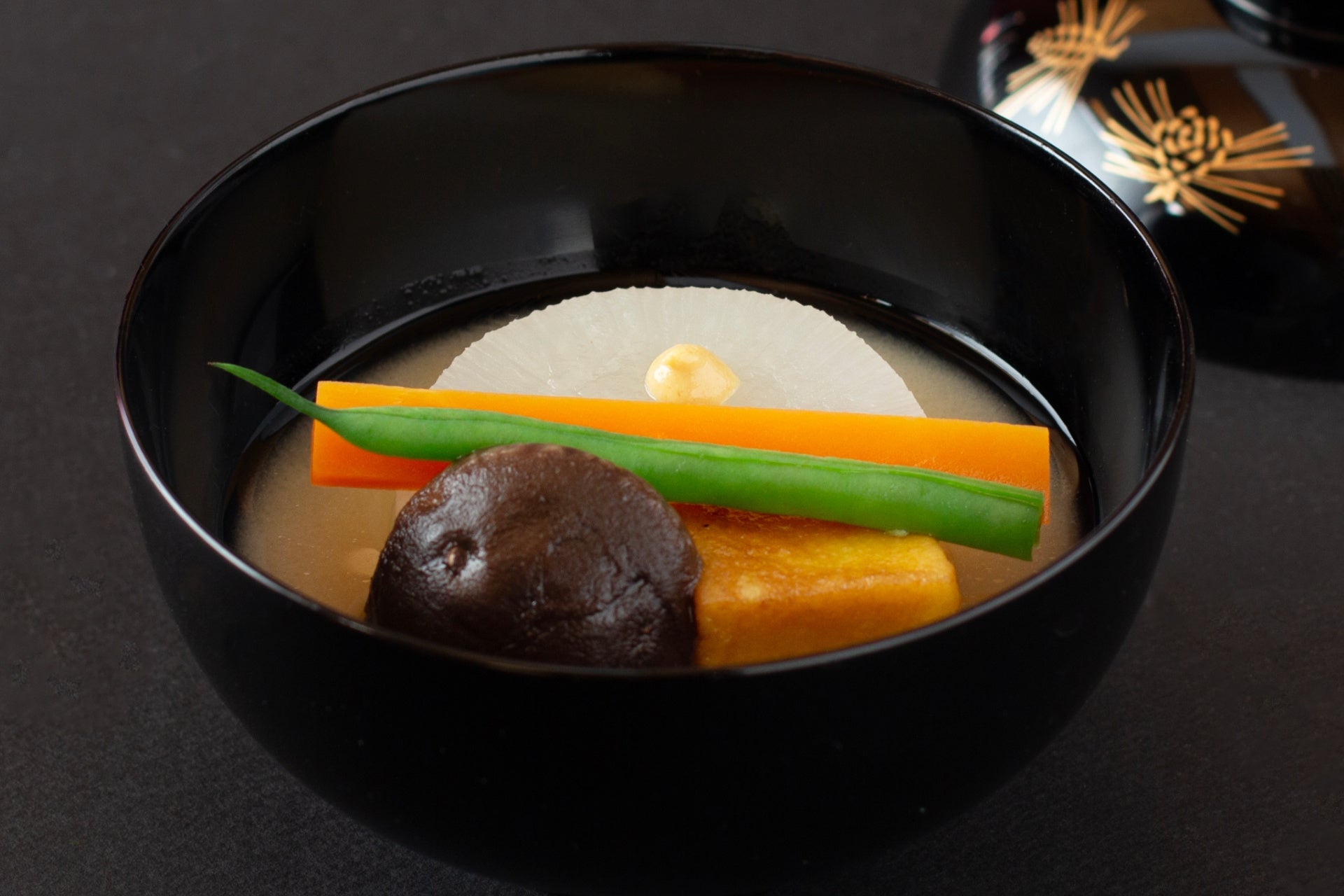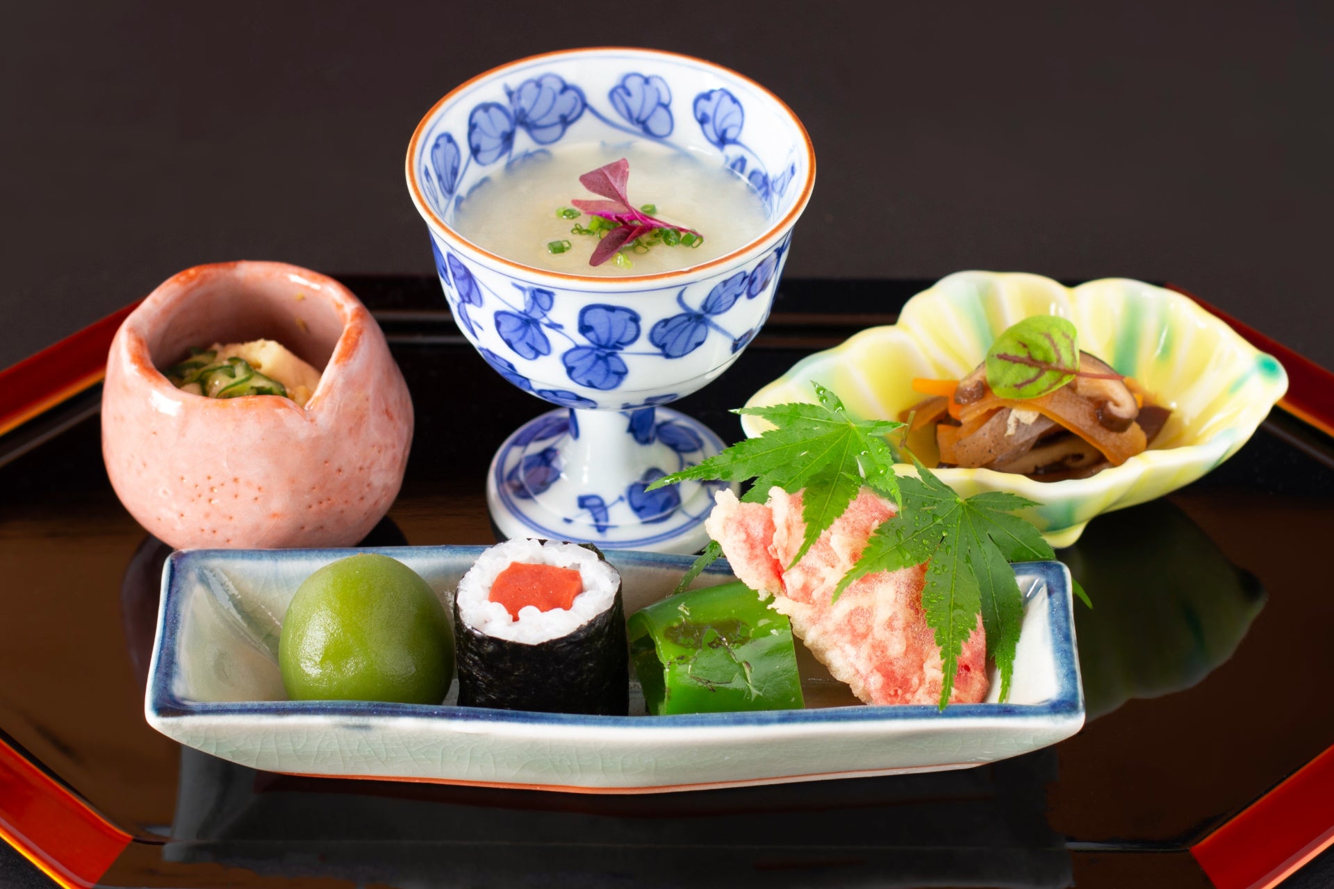 自家製の西京味噌と昆布だしをあわせた自慢の煮物椀などこだわりのヴィ―ガンメニュー。多様な食のニーズにお応えするだけでなく、誰もが一緒に食事を楽しめるような時間を提供します。同テーブルで別のコースをご注文いただくことも可能で、先付から水菓子まで関西の美味を詰め込んだこの時期だけの会席を皆さまでお楽しみください。