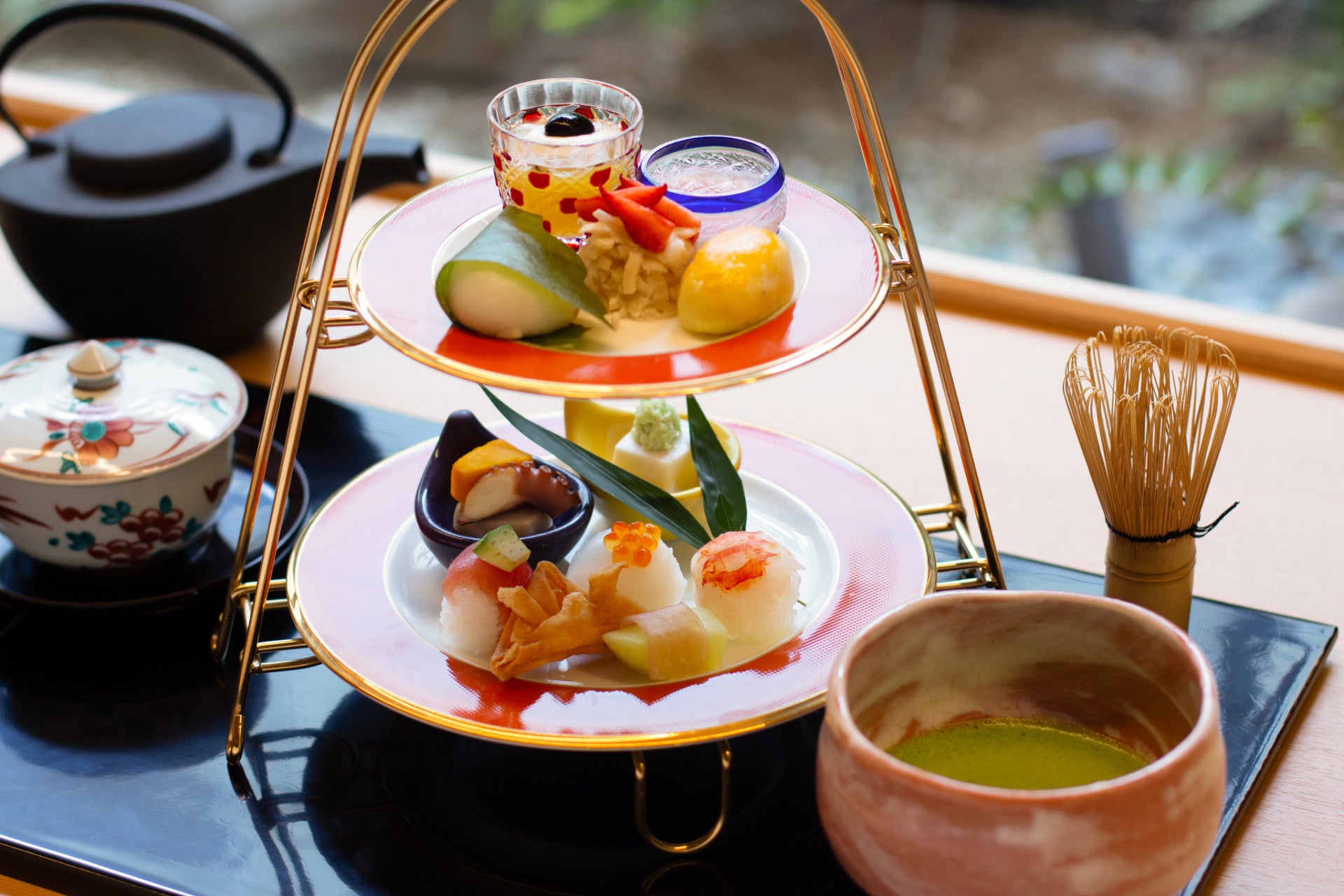 創業昭和48年の老舗和菓子屋サザエとコラボレーションしたアフタヌーンティーを1日限りで開催いたします。(8組様限定)作り立てのサザエの銘菓おはぎや京都祇園あのん名物あんぽーね、本格的な日本料理を味わえるセイボリーを、新緑がまぶしい箱庭臨む空間でお召し上がりいただけます。さらに、都会に居ながら日本文化に触れ心整う時間をお届けする茶道体験は、茶室「成俊庵」にてお点前や流派など気にせず初心者の方でも気軽に楽しめるプログラムです。