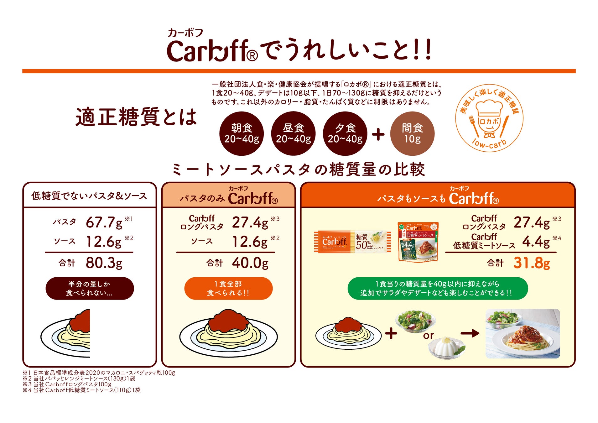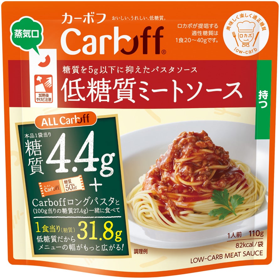 「Carboff低糖質ミートソース」は、豚ひき肉とたまねぎ、ビーフエキスとスパイスで仕上げた糖質量が5g以下のパスタソースです。電子レンジ対応パウチを使用しているのでレンジでの調理が可能です。低糖質シリーズの「Carboffロングパスタ」と組み合わせると、1食あたりの糖質量をさらに抑えることができます。一般社団法人食・楽・健康協会(ロカボ協会)では、糖質は血糖値を上げる原因とされており、適正な糖質摂取を心がけることで血糖上昇を抑えることができるとし、1食で摂取する糖質量を20~40g、間食10gを入れて1日70~130gに抑える“適正糖質”を提唱しています。