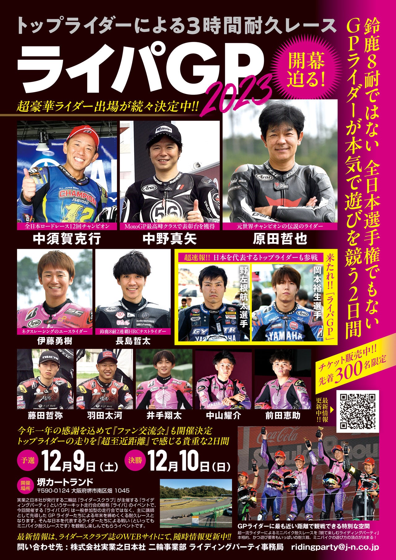 実業之日本社が発行する二輪誌『ライダースクラブ』が主催する『ライディングパーティ』というサーキット走行会の略称『ライパ』のイベントで、今回開催する『ライパ GP』は一般参加型の走行会ではなく、主に講師として先導した GP ライダーたちによる年末を締めくくる耐久レースとなります。そんな日本を代表するライダーたちによる戦い(といってもミニバイク耐久レースです)を観戦し楽しんでもらうイベントです。