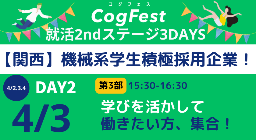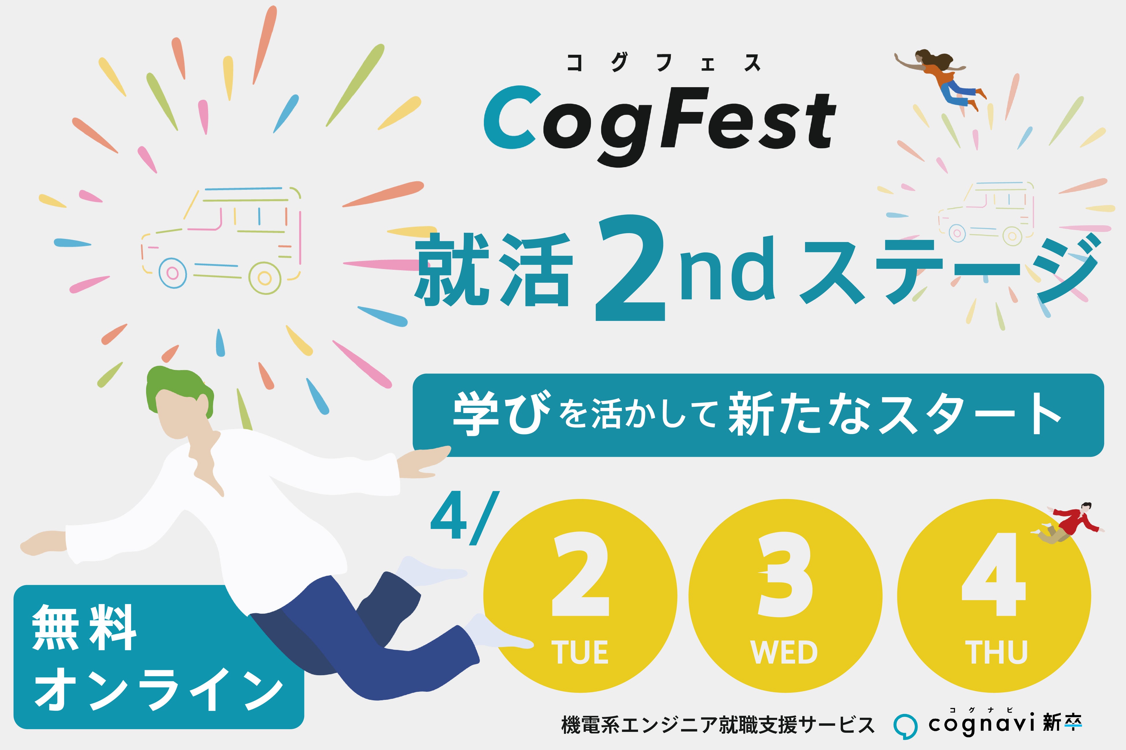このイベントはオンライン就活フェアサイト「CogFest」(以下「コグフェス」)内で開催され、「コグナビ新卒」に会員登録をした理工系学生は無料ですべてのオンラインセミナーを受講することができます。コグフェスの出展企業は、理工系学生をエンジニアとして求めている大手メーカーが中心となります。