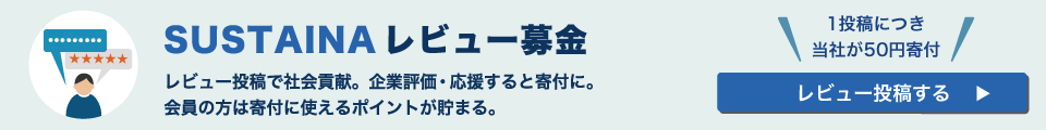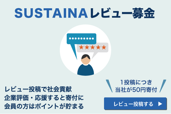 ログインユーザー(一般会員が対象)がレビュー投稿を行った場合、「レビューコメント100文字につき50ポイント」貯まります。貯まったポイントは「SUSTAINA®ポイント募金」で任意の団体に寄付頂けます。