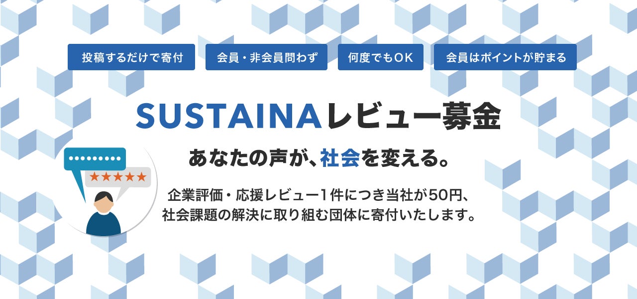 SUSTAINA®、企業評価・応援レビューすると寄付できる「レビュー募金」を開始。”あなたの声が、社会を変える” 企業と社会課題に取り組む団体を応援しよう。