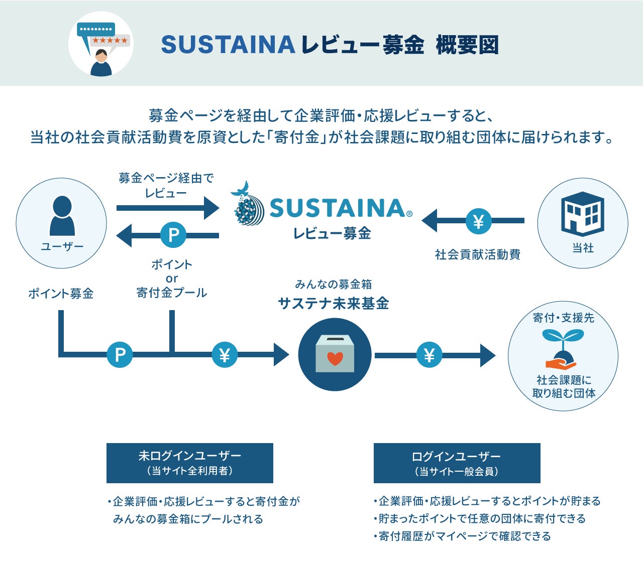 未ログインユーザー(全利用者が対象)がレビュー投稿を行った場合、「1投稿につき50円」、当社が社会課題に取り組む団体に寄付するための募金箱「サステナ未来基金」に寄付金をプール致します。