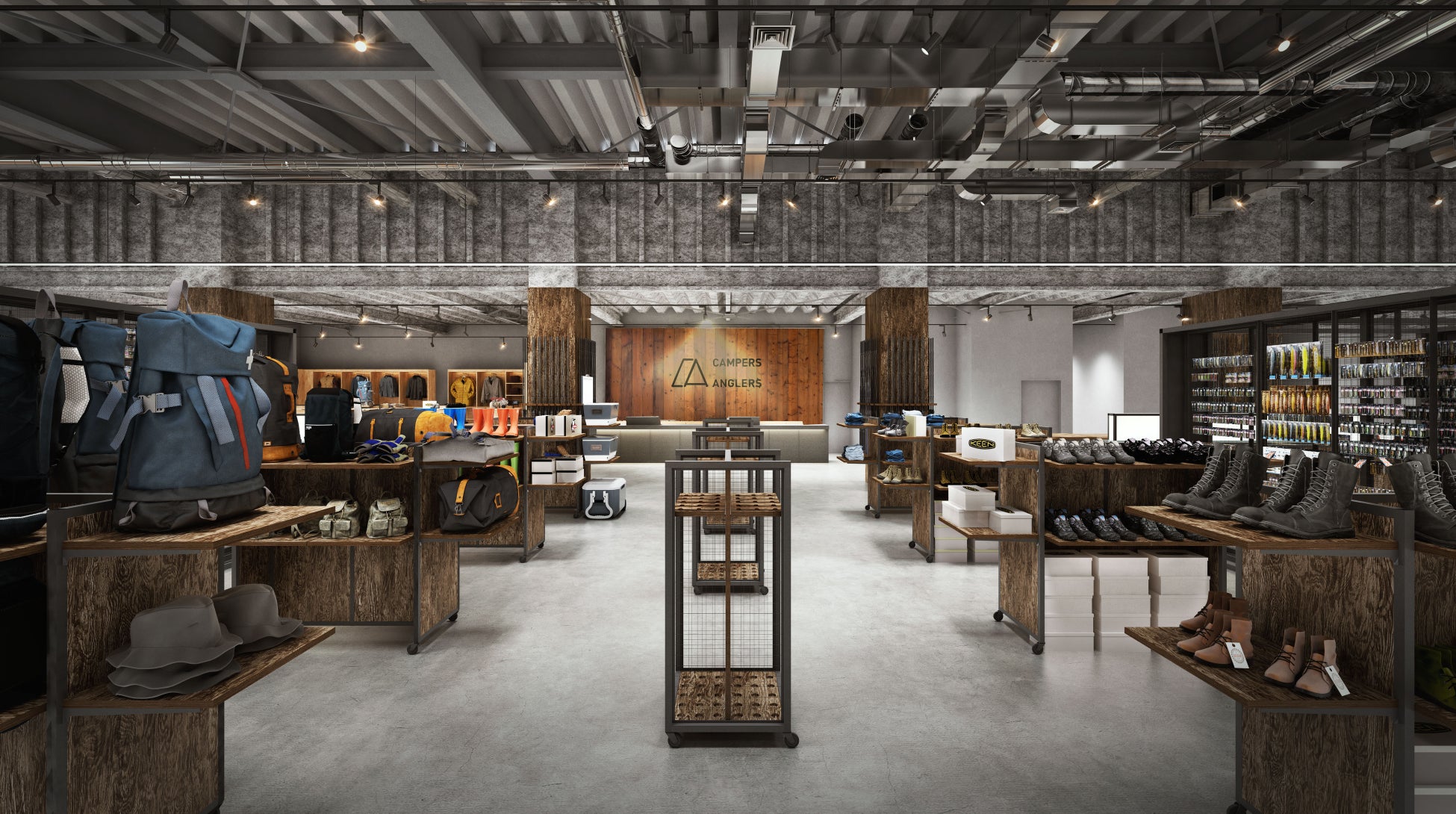 テントやタープなどのキャンプギアをはじめ、アパレルも豊富に取り扱うと同時に、C&Aの本領でもあるフィッシングの商品を店内中央に配置し、キャンピングとフィッシングを融合させた世界観を感じられる店舗となっています。