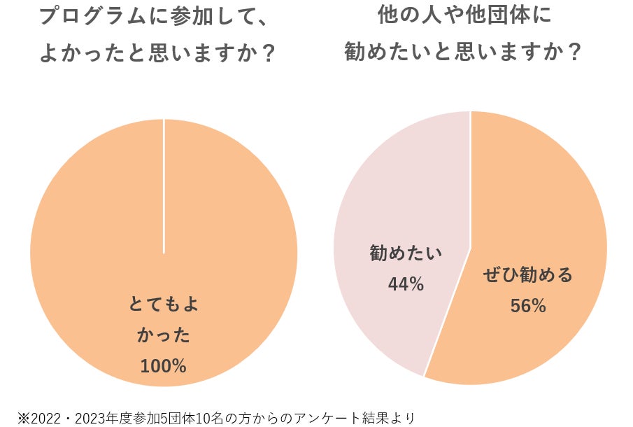 2022・2023年度に参加したNPOスタッフ等の満足度は100%。日頃、ネガティブな悩みを聞いてもらったり、相談したりできる機会がほとんどなかったという参加者もいるなか、メンタリングによって非常に前向きな変化を実感されている声が多数寄せられました。