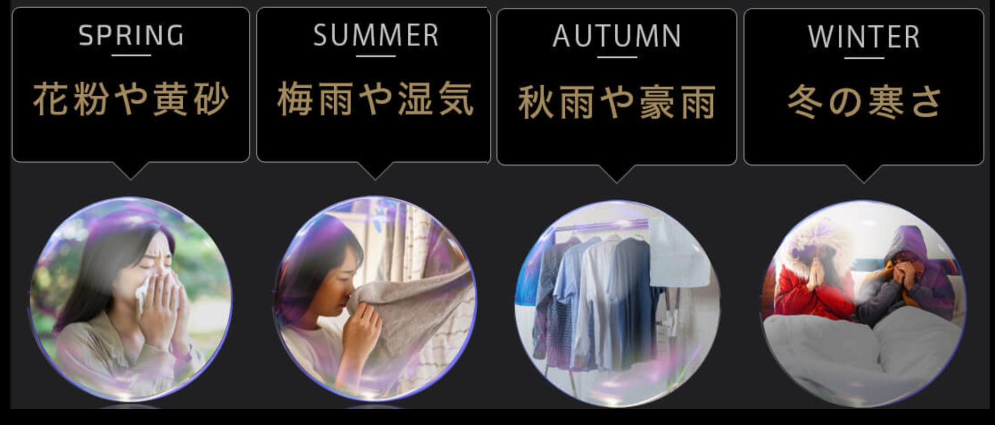 ・春の花粉や黄砂、夏の湿気、秋雨、冬の寒さといった季節特有のストレスからユーザーを解放。一年中快適な睡眠環境を提供します。