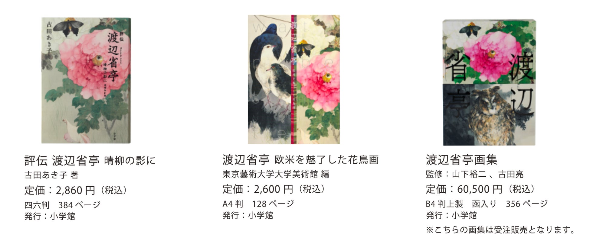 本展の出展作品24点を含めた150点以上の省亭の名品が収載された同画集は、渡邊省亭という絵師の画業の全貌をご覧いただける大変貴重な一冊です。本展会場にてお求めいただくと全国送料無料となりますので、この機会にぜひお求めください。さらに、2021年に東京藝術大学大学美術館で開催された『渡辺省亭—欧米を魅了した花鳥画—』の公式ガイドブックや省亭初の評伝『評伝 渡辺省亭 晴柳の影に』(古田あき子 著)も販売いたします。