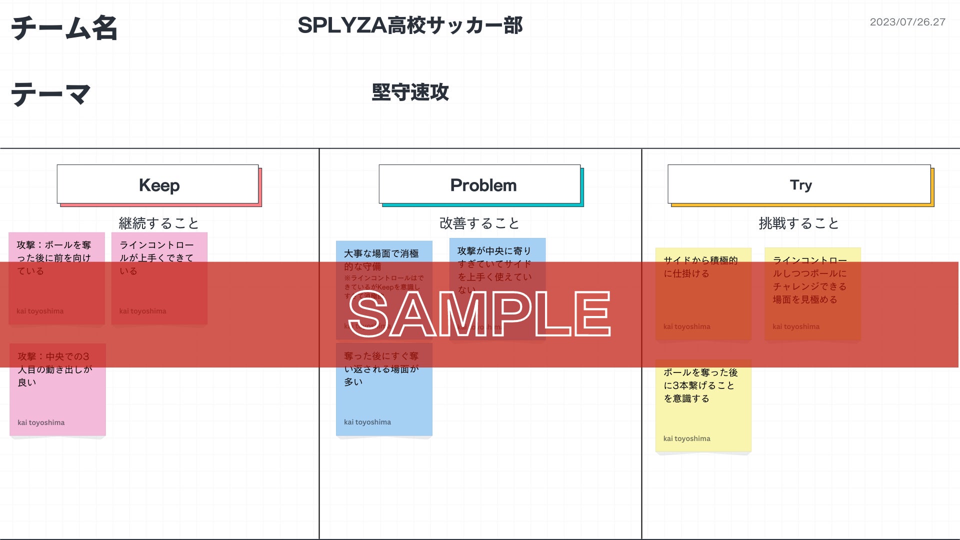 各チーム事前に決めたテーマをもとに、SPLYZA Teamsで当日の自分たちの試合映像を見ながら、KPT法を用いた振り返りとプレゼンテーションを行います。