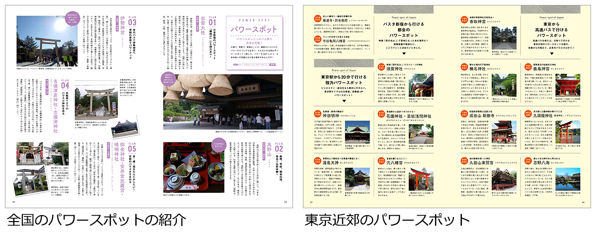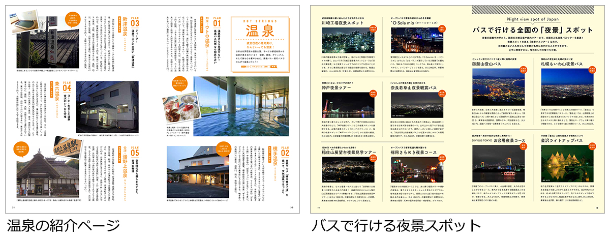 その他、出雲大社などのパワースポットや、バスとりっぷにて好評の豪華バス、乗車記漫画、高速バス・夜行バスで行ける夜景、花見、夏祭り、花火大会なども掲載されています。