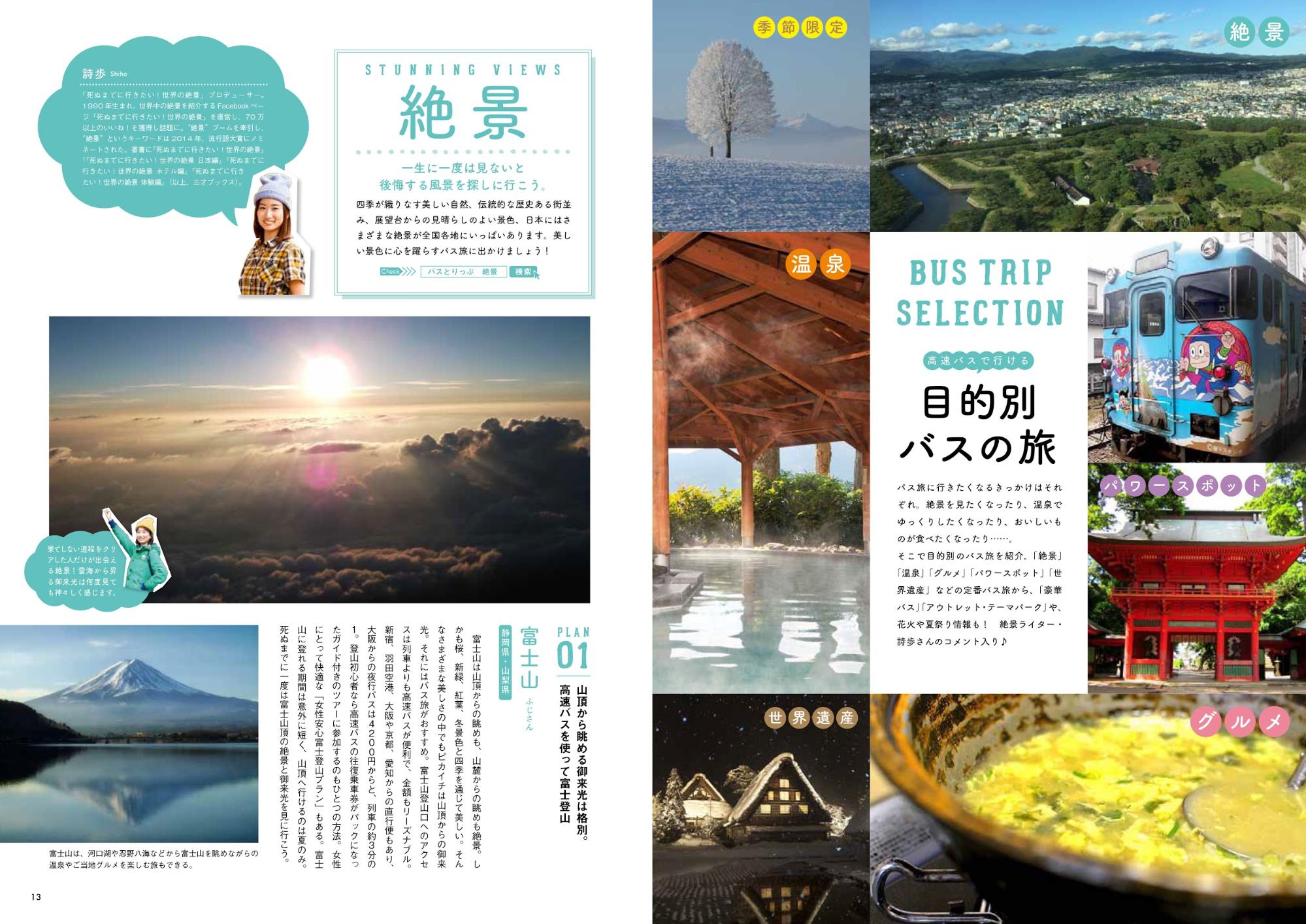 絶景、温泉、グルメ、パワースポットなど目的別にバス旅を紹介。絶景のバス旅では、「死ぬまでに行きたい!世界の絶景」シリーズの著者・詩歩さんがナビゲーターとなり、富士山、東尋坊、三段壁、五色沼、四万温泉、山寺など日本各地の絶景を紹介します。