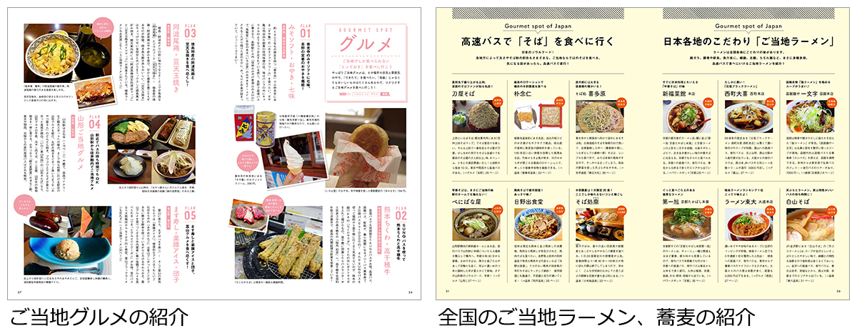 温泉のバス旅では、乳頭温泉や修善寺温泉、玉造温泉や道後温泉などの名湯から、新津温泉やウトロ温泉、崎の湯など、知る人ぞ知るディープなものまで掲載しています。また、グルメに関しては、ご当地でしか食べられないものを中心に、長野、熊本、徳島、山形などの11のバス旅を紹介。さらに日本各地のご当地ラーメンや蕎麦、スイーツのおすすめ店舗も掲載しています。