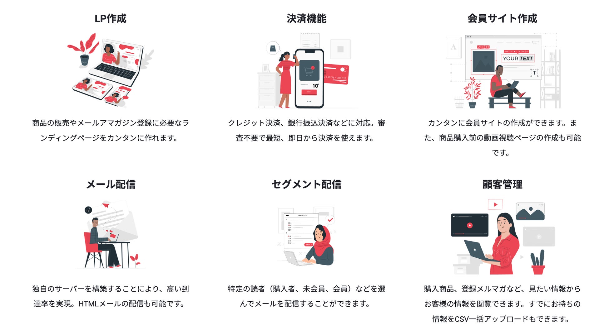 本サービスでは、オンライン講座の販売から、レッスン動画の提供までに必要な機能を無料で使うことができます。操作性を重視し、専門的な知識や技術がなくても目的に応じたWEBページ、会員サイトも作成できます。また、メール配信機能も搭載することで、販売からコンテンツの提供までワンストップで行うことができます。これまで、専門知識や技術がなくWebページや会員専用サイトを作れなかった企業や個人、知識や技術はあるが制作時間が確保できなかった企業や個人の可能性を広げるツールとしてリリースしました。