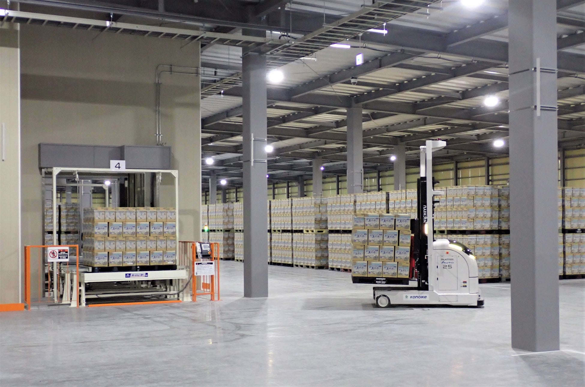 鴻池運輸株式会社(本社:大阪市中央区、代表取締役会長兼社長執行役員 鴻池 忠彦、以下 鴻池運輸) は、サントリー天然水専用保管・配送拠点「安曇野営業所 第2倉庫」(⻑野県安曇野市)が完成し、2024年4月23日(火)に竣工式を実施しました。当倉庫2階にはレーザー誘導方式無人フォークリフト(Automated Guided Forklift、以下 AGF)を導入し、2階フロア全体を無人で運用します。