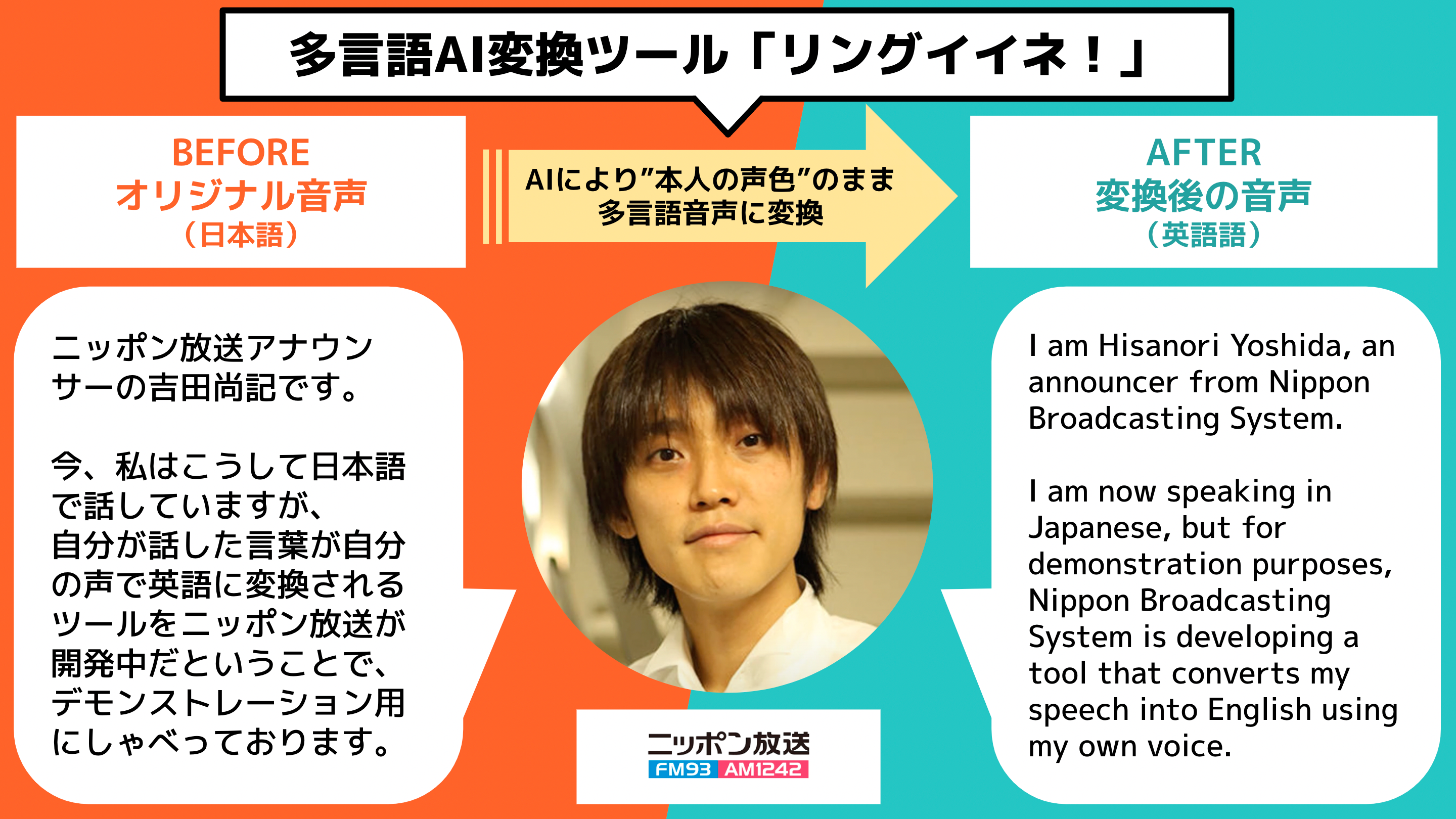 (I am Hisanori Yoshida, an announcer from Nippon Broadcasting System. I am now speaking in Japanese, but for demonstration purposes, Nippon Broadcasting System is developing a tool that converts my speech into English using my own voice. I can't really imagine myself speaking fluent English, but I wonder what the result will be?)