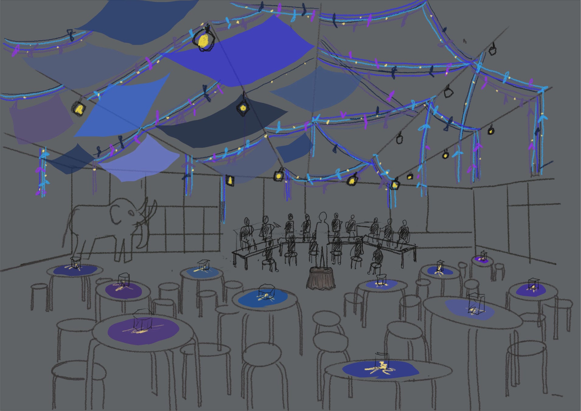 舞台芸術におけるサステナブルな取り組みについての研究を行う舞台美術家の大島広子さんがデザインした古布を使った空間演出。『Earth ∞ Pieces』のキービジュアルである<宇宙と星々>から着想しています。また異素材の組み合わせで表現されるこの天幕は、横浜市青葉区を拠点に活動する「NPO法人森ノオト」がコミュニティの方々と共に制作します。