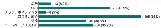 撮影マッチングプラットフォーム以外だと、ほとんどは口コミや紹介で仕事を増やしており、その次にSNSを活用して集客しています。その他営業やホームページなど、さまざまな方法で仕事を増やしているようです。