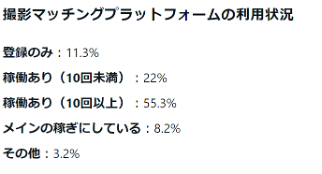 撮影マッチングプラットフォームをメインの稼ぎにしている人は1割弱で、ほとんどの方は収入の1つの柱として利用していることが伺えます。