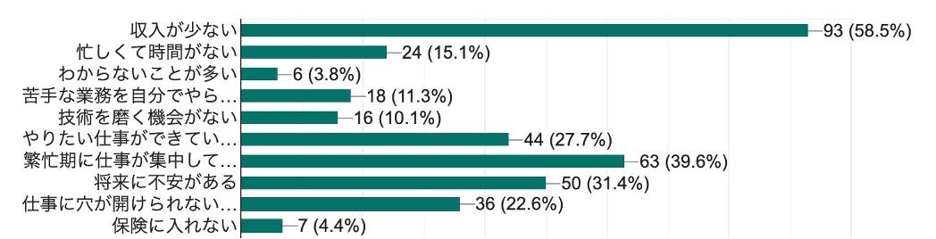 半数以上の人は収入についての課題を感じています。また、フリーランスの方が多いので、繁忙期の問い合わせが多く、閑散期とのギャップに課題を感じている方も多いです。